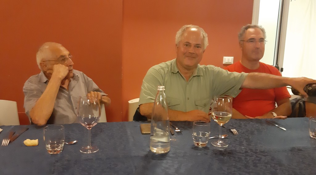 Tornant al vessant social de la fira, després d’una tarda intensiva d’intercanvis, puntualment a les 19:30 h tots vam tancar la paradeta per a traslladar-nos al restaurant on se celebraria el sopar de germanor, la “cena conviviale”. Tot i que el sopar no era a compte de l’organització, l’assistència va ser molt nombrosa, assistint prop de setanta persones. La vetllada va resultar molt agradable, plena de bon humor, on tothom explicava les seves aventures mineralògiques. Nosaltres vam tenir la sort de caure al costat d’en Marco Sturla, un dels membres més actius del G.M.C i de la fira. De la seva veu vam poder conèixer el grup i les seves activitats però, sobretot, ens va posar les dents llargues quan ens explicava els viatges mineralògics que havien organitzat en els darrers anys, en col·laboració amb altres grups d’arreu del món. En Marco ens relatava com havien estat en els jaciments més interessants del món, com els de Namíbia, Rússia o les Açores, acompanyats sempre d’experts i acadèmics de la zona. Com anècdota ens va explicar que en un dels viatges, ell mateix es va adonar que era l’únic de l’expedició que no tenia un mineral amb el seu nom. El sopar va ser realment intens i es va prolongar fins més enllà de les 22 h, moment en què vam marxar a descansar ja pensant en la jornada de l’endemà.