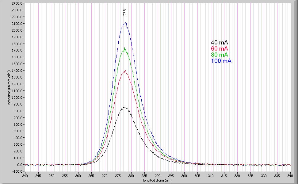 La figura 1 mostra l’espectre d’emissió d’un aquests díodes quan varia la intensitat. D’acord amb el fabricant, la intensitat màxima que pot suportar (el díode LED està muntat sobre un dissipador de coure) és de 100 mA. S’observa com el màxim d’emissió té lloc al voltant de 278 nm d’una manera pràcticament independent de la intensitat. La banda d’emissió és relativament ampla però no interfereix en l’observació de l’espectre de fluorescència a partir de 310 nm. Com que la potència és baixa (2 a 5 mW segons el fabricant) si el LED es vol fer servir només com a font d’ona curta per a observar la fluorescència en llum visible, s’ha de posar relativament a prop de la mostra (figura 2).