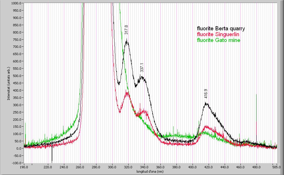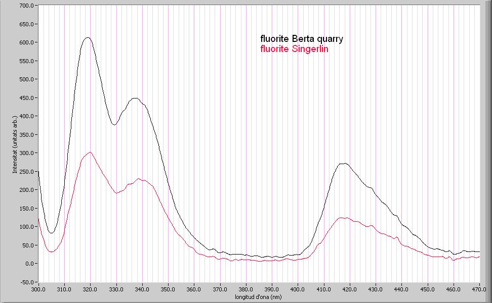 S’ha pogut estudiar una col·lecció de fluorites de Catalunya, cedides amablement per Frederic Varela. Pel que fa a la fluorescència en la regió UV, només s’ha trobat que és destacable en la de la pedrera “Berta” (el Papiol-Sant Cugat del Vallès) i en la de Singuerlín (Santa Coloma de Gramenet) (figura 3). En moltes de les altres fluorites hi ha bandes, però són poc intenses. La banda que té el màxim a 416 nm correspon al color blau-violeta característica de la fluorescència visible d’aquestes mostres i és deguda a l’europi (Eu2+). Les bandes a 317 i 337 nm, que no podem veure directament, corresponen a fluorescència en la regió UV corresponent, d’acord amb les referències bibliogràfiques (2) a ceri (Ce3+). S’observa que algunes bandes de fluorescència estan superposades a la intensa emissió del LED; mitjançant tractament numèric dels espectres es pot eliminar o reduir aquesta banda (figura 4).