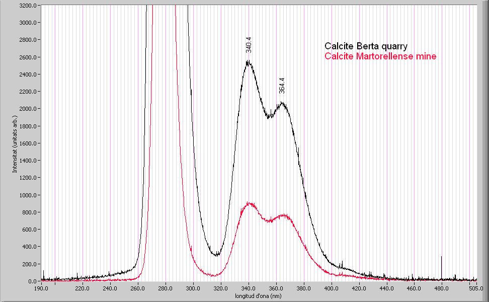 Una sorpresa ha estat la intensa fluorescència en l’UV de calcites que donen fluorescència vermella amb ona curta, com ara les de la mina “La Martorellense” (Martorell-Castellví de Rosanes) i de la pedrera “Berta” (figura 5). La fluorescència vermella és deguda a Mn2+, mentre que en la fluorescència en l’UV les bandes centrades a 340 i 364 són degudes a Ce3+ ( referència 2)