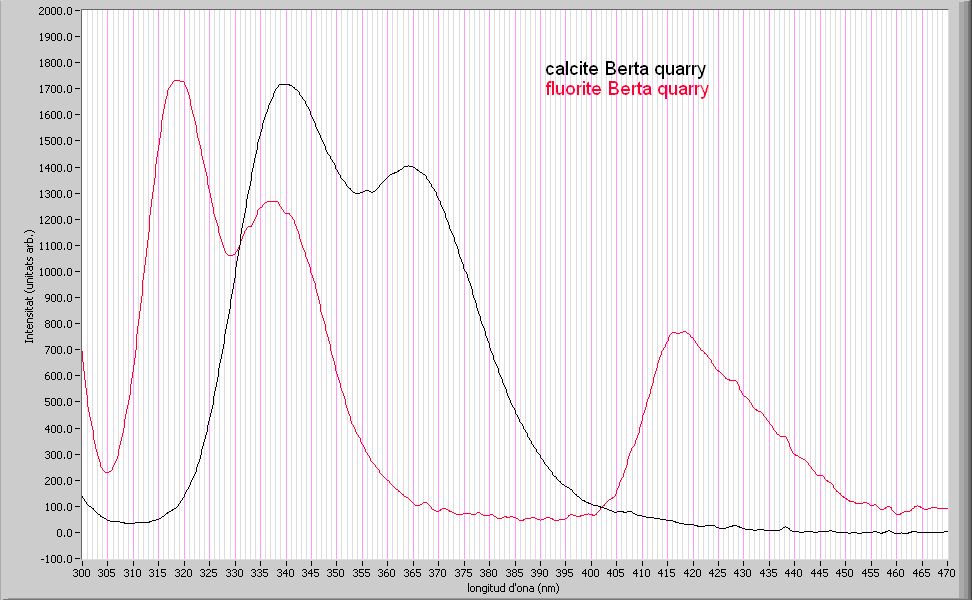 Si es comparen els espectres de la fluorita i la calcita de la pedrera “Berta” (figura 6) es comprova com les posicions de les bandes degudes a Ce3+ estan desplaçades en un mineral respecte l’altre. Encara que es tracti del mateix ió (Ce3+), el diferent entorn que té en la xarxa cristal·lina de cadascun dels minerals fa que la posició dels nivells d’energia dels orbitals sigui diferent i, per tant, també ho sigui l’espectre. Aquestes variacions són especialment notables en la fluorescència del Cr3+ en la regió del vermell-infraroig.