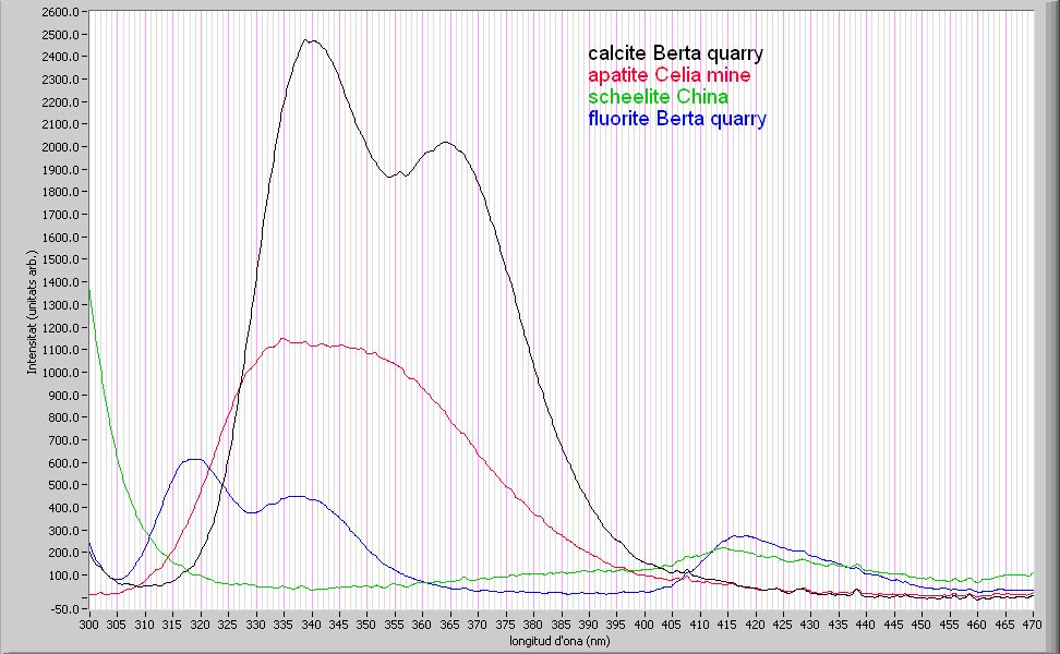 La figura 7 mostra els espectres d’altres minerals. És especialment remarcable el de l’apatita de la mina “La Celia” (Jumilla, Múrcia) que dona, a més d’una bonica fluorescència visible de color taronja, una banda ampla en la regió UV. La scheelita dona una banda molt ampla i no gaire intensa que està centrada a 415 nm (color violat) però que s’estén força cap el visible i l’UV.