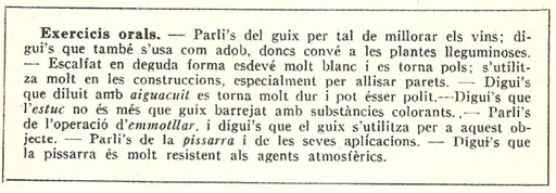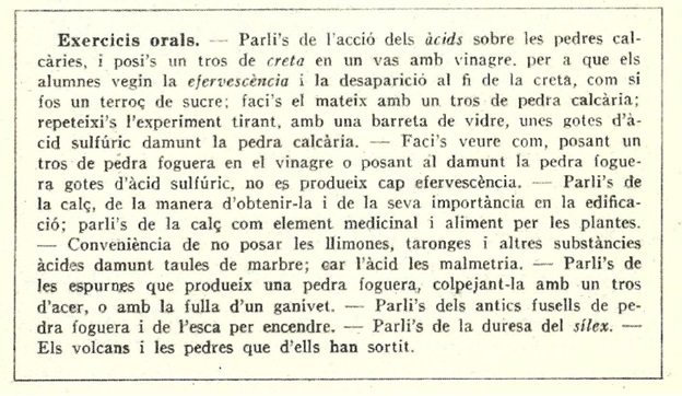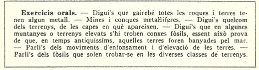 Em sembla interessant destacar el fet de trobar, al final de cada lliçó, uns “Exercicis orals” el contingut dels quals és, sens dubte, un petit aprofundiment tècnic del que s’acaba de veure en els paràgrafs anteriors i que, probablement, era tema dels exàmens orals, tant típics d’aquells temps: