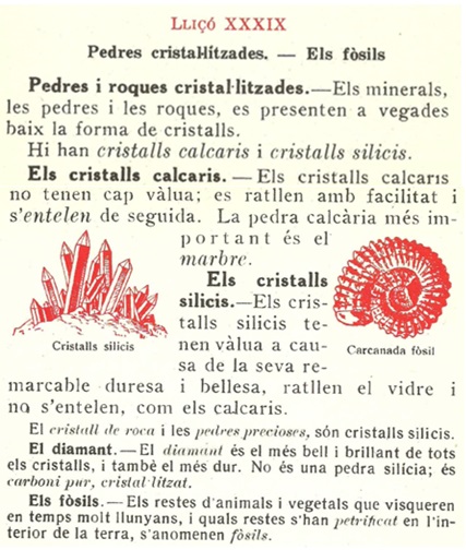 Arribem a la lliçó XXXIX on apareixen finalment els minerals, tinguts, en aquell moment, com a “pedres cristal·litzades”. Se’ns hi exposa una molt bàsica classificació, encara que sense haver tingut en compte la ja existent classificació de J.D.Dana (James Dwigth Dana, febrer 1813 – abril 1895):