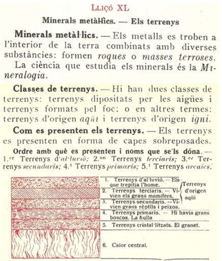 I arribem a la darrera lliçó d’aquest capítol dedicat a la Història Natural, més concretament a la Mineralogia i Geologia, la lliçó XL, en la que se’ns presenta una classificació dels diferents “terrenys”: