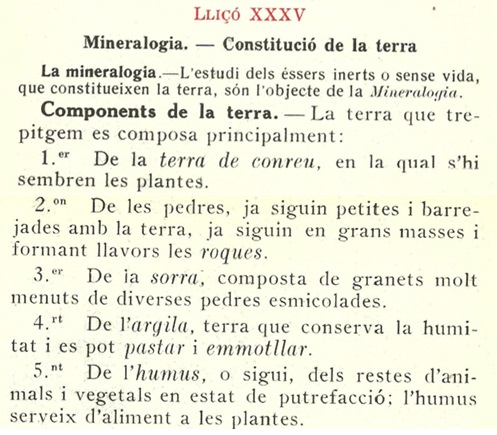 La primera d’aquestes lliçons ens parla del concepte de mineralogia i, com tants i tants libres de geologia de l’actualitat (més de 90 anys després), de la constitució de la Terra: