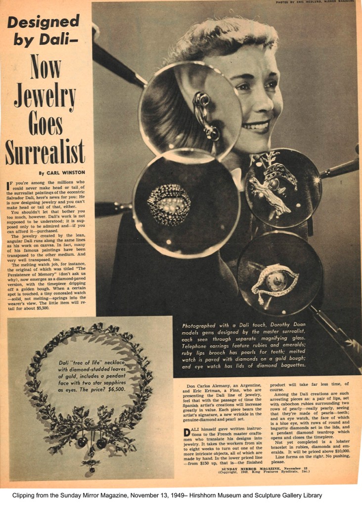 Del 1941 al 1958 Dalí va dissenyar una col·lecció de joies i va seguir tot el procés de creació associat amb Ertman i Alemany, dos joiers establerts i orfebres a Nova York. Dalí en feia els esbossos que posteriorment es convertien en escultures que combinaven tota mena de materials nobles. Al llarg de la seva vida va seguir creant noves joies, moltes de les quals es poden gaudir al Teatre-Museu Dalí de Figueres.