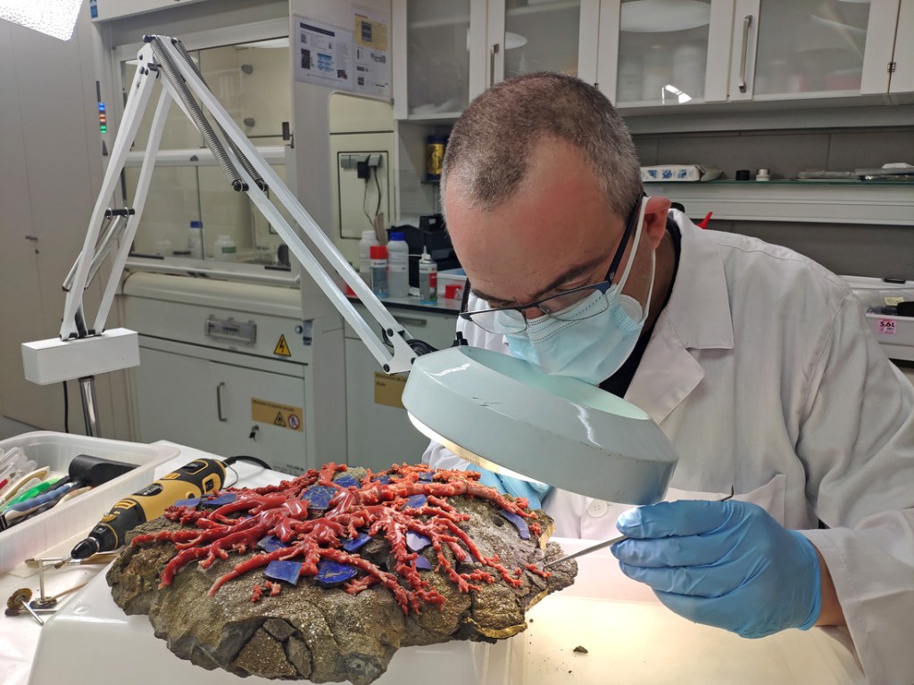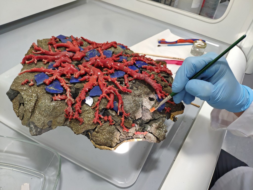 Es va fer una profunda recerca bibliogràfica dels mètodes coneguts en la conservació de minerals, centrant-nos en el “pyrite-decay” o “desintegració de la pirita” (un títol molt dalinià). Diversos mètodes es van posar sota judici, però les característiques de la peça -amb coralls i lapislàtzulis enganxats amb resines-, la mida de l’exemplar i la seva estructura no ens permetien emprar certs mètodes.