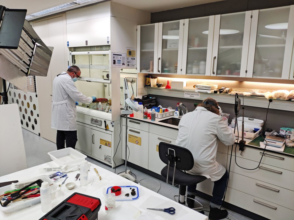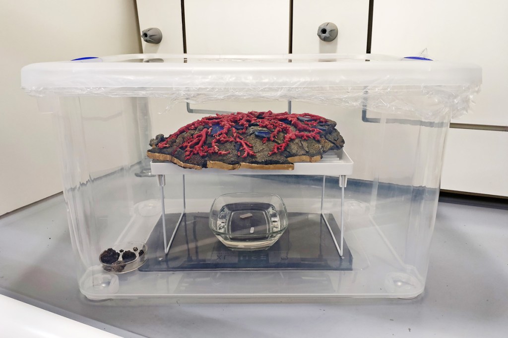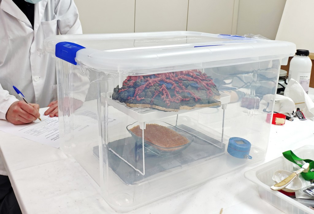 Ara la peça reposa en el seu sarcòfag-tupperware , acompanyada de sílica-gel dessecant, a l’espera que la vitrina de l’exposició es condicioni per a mantenir una atmosfera seca de forma permanent.