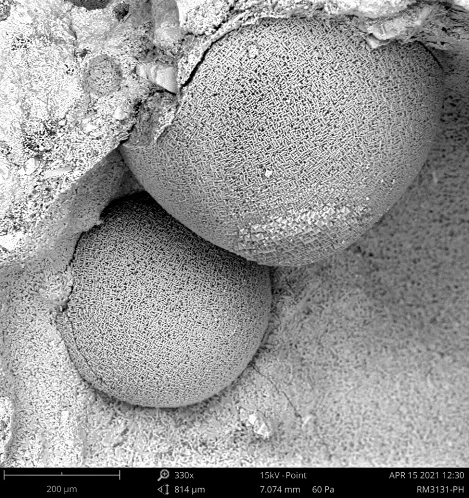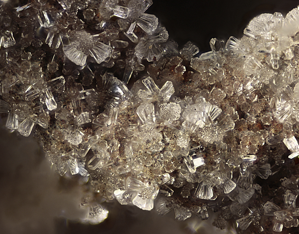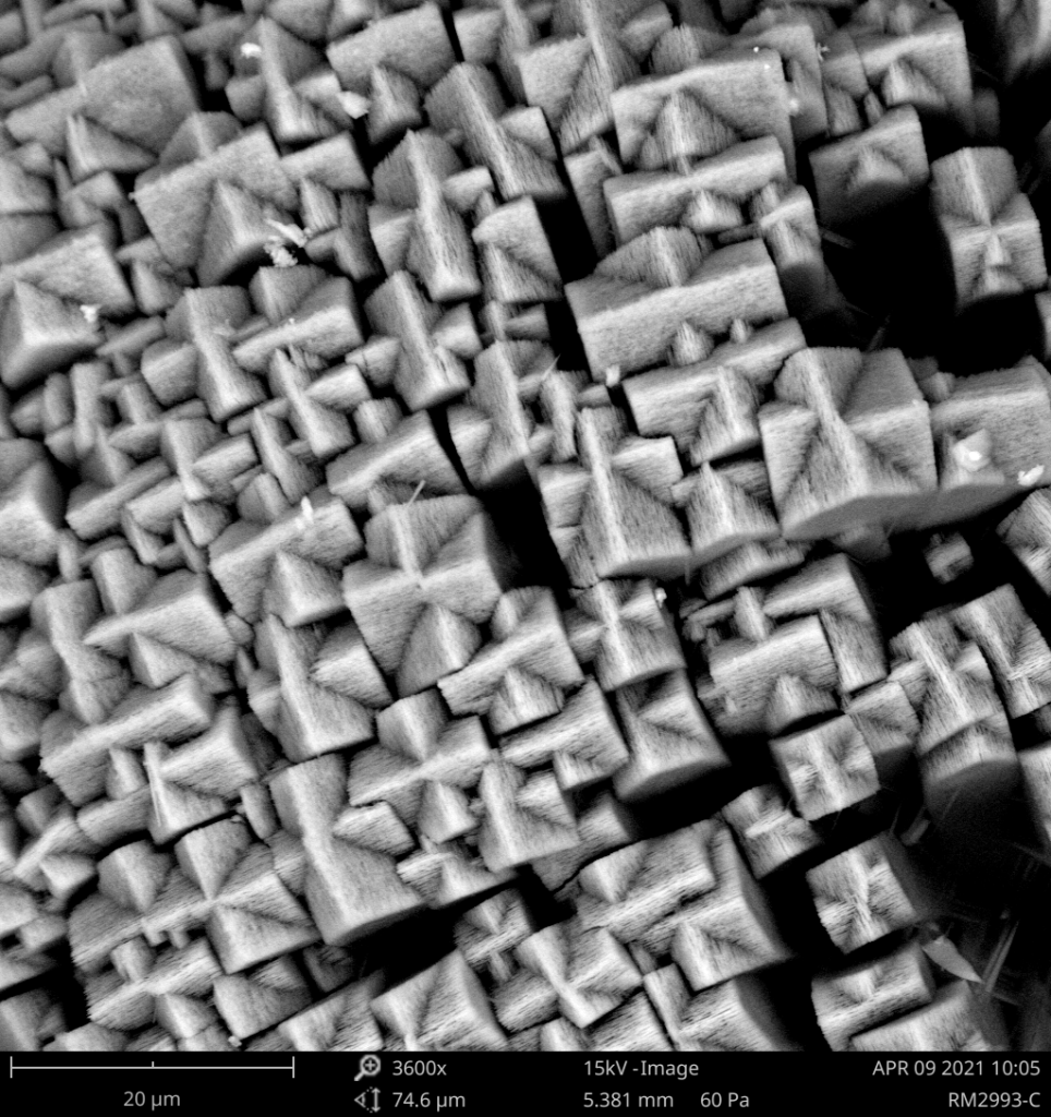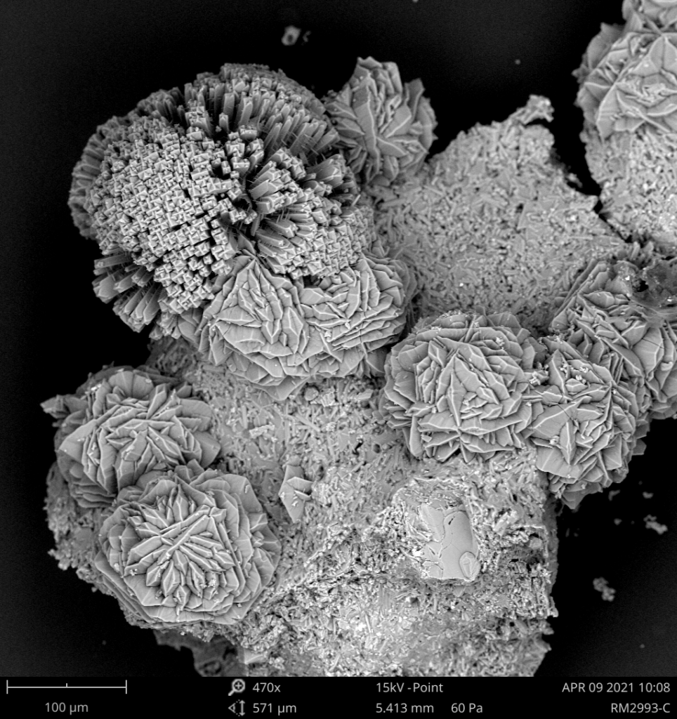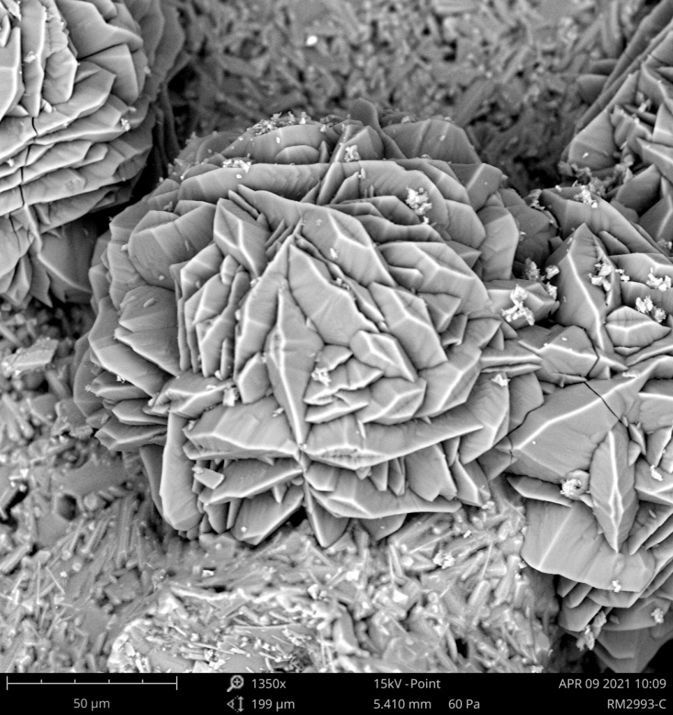 Les imatges del microscopi electrònic de rastreig van mostrar dos tipus d’agregats cristal·lins en els cristalls brillants: uns formats per prismes allargats maclats en “creu” i uns altres formats per cristalls d’aspecte lenticular, també maclats.