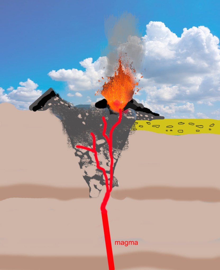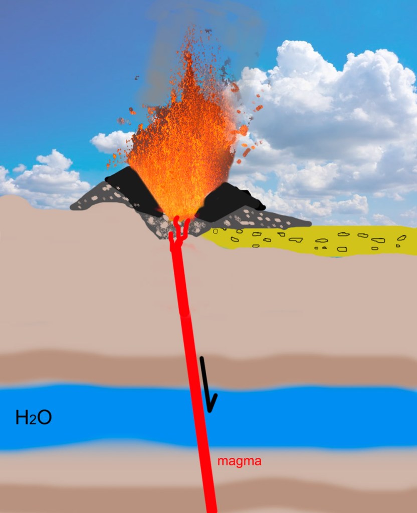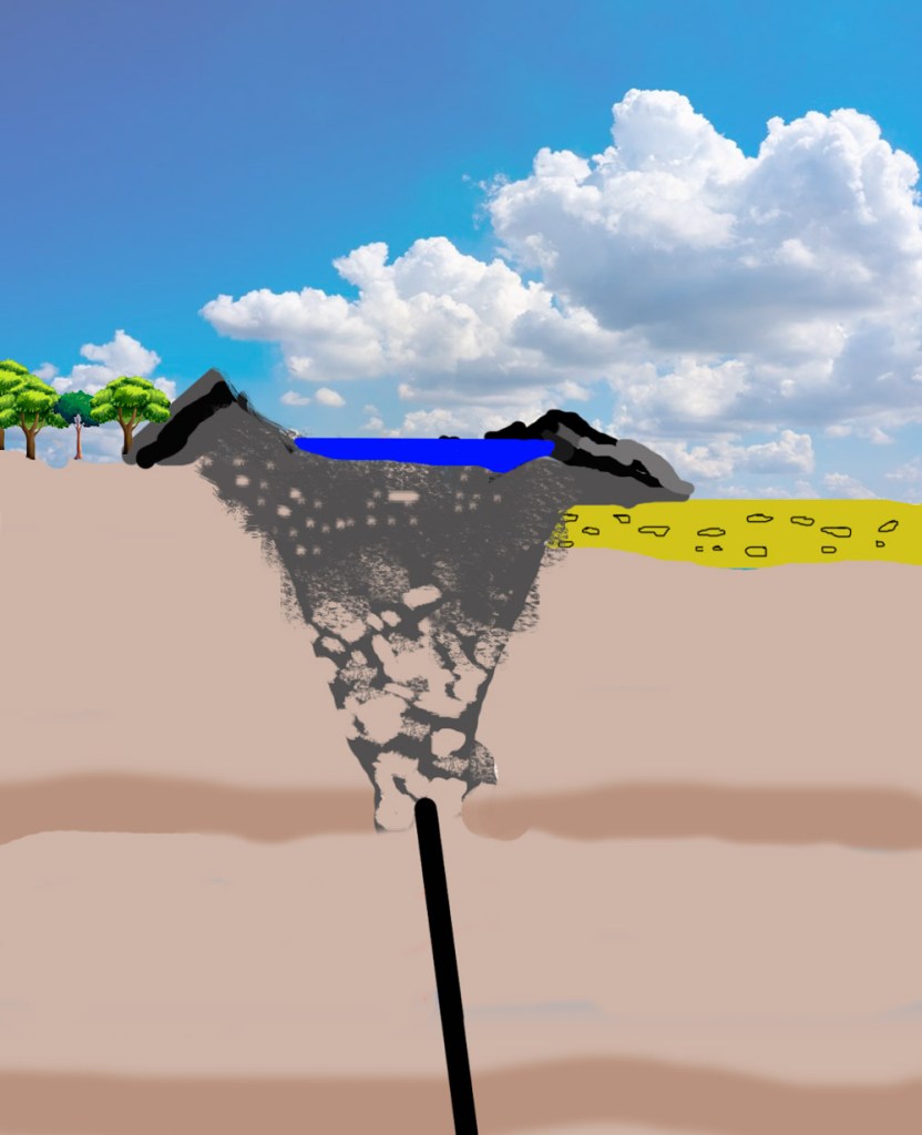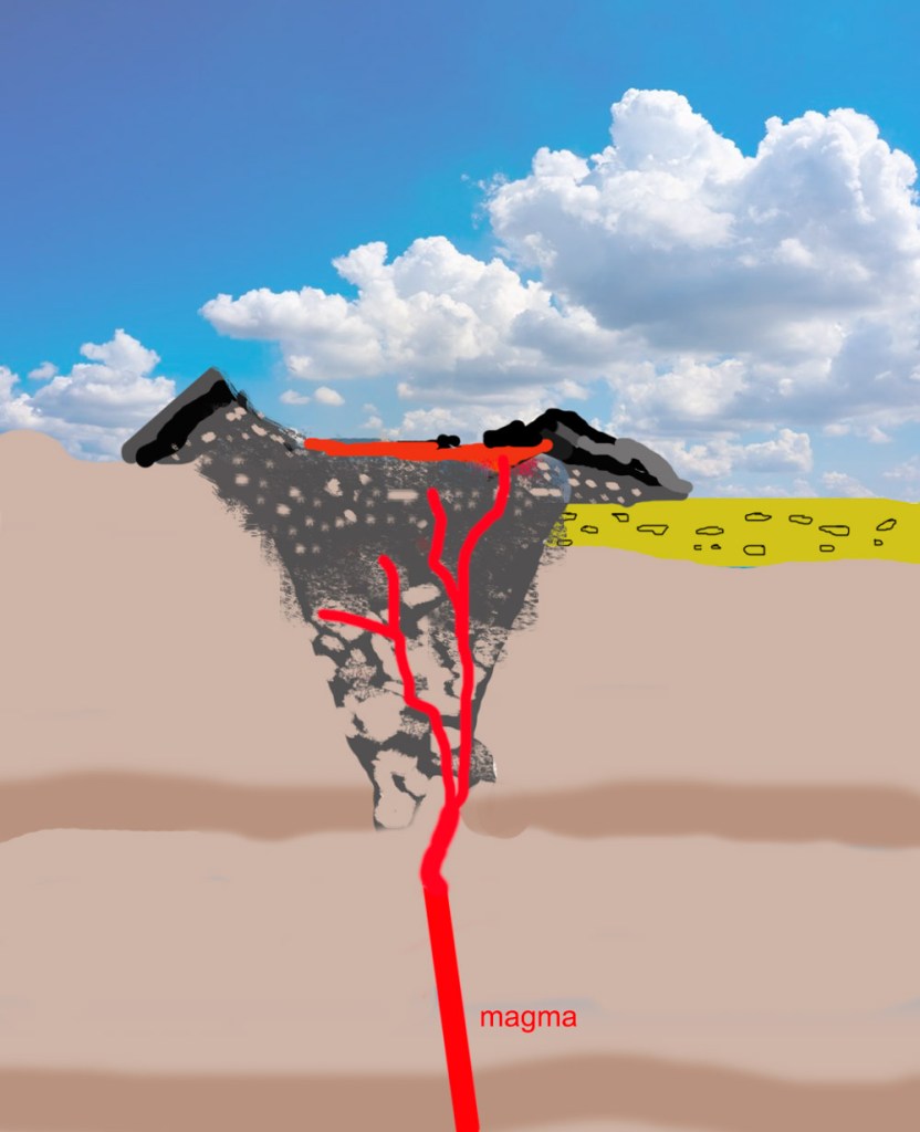 IV. Fase freatomagmàtica-2. La baixada de pressió del magma permet que l’aigua d’aqüífers profunds penetri i es doni un conjunt de violentes explosions freatomagmàtiques que destrueixen el con de gredes estrombolià.