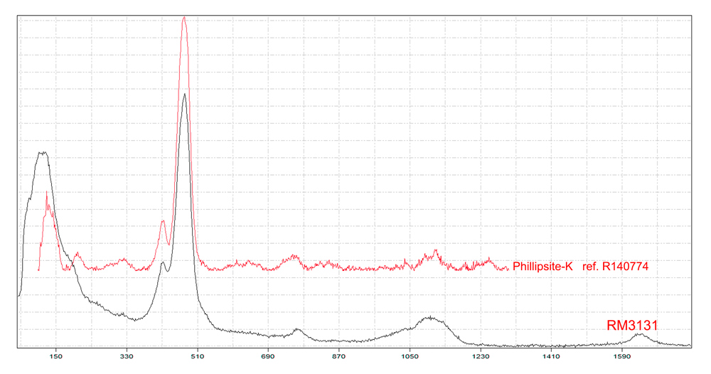 En el cas dels agregats globulars (RM3131) vam obtenir un espectre coherent amb la phillipsita. Es va enregistrar tant la zona de baixa freqüència com la d’alta, on trobem els modes vibracionals de les molècules d’aigua.