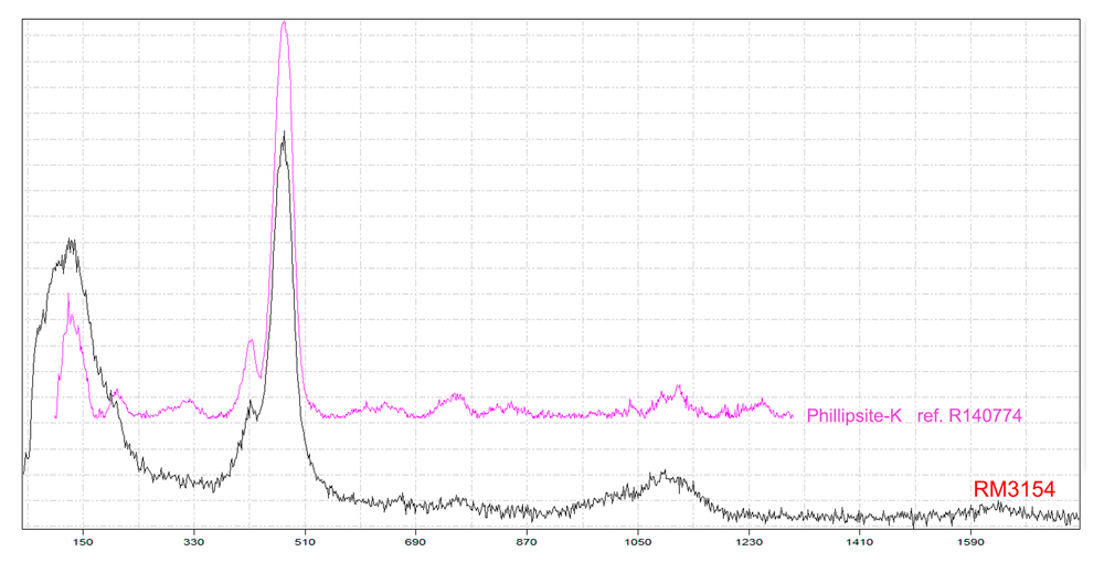 Aquestes composicions són molt comunes en les zeolites. Amb aquests resultats, ja vam poder confirmar, pel seu hàbit cristal·lí, la phillipsita-K en el cas dels cristalls prismàtics maclats en “creu” (RM3154). Tanmateix, ho vam confirmar mitjançant l’espectre Raman.