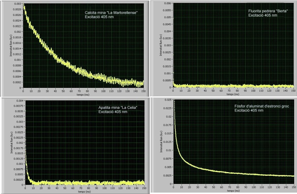 Un dispositiu relativament senzill per a determinar la durada de la fluorescència consisteix en il·luminar la mostra amb un làser (un díode làser violat de 405 nm és una bona opció) modulat de manera que doni polsos molt curts de llum. Amb un circuit senzill basat en un fotodíode o un sensor de llum just al costat de la mostra que s’il·lumina, es mesura la llum emesa. Els senyals elèctrics es capturen amb un oscil·loscopi digital o un sistema d’adquisició de dades; en aquest darrer cas resulta més senzill poder fer el tractament dels senyals per a mesurar la vida mitjana de fluorescència del mineral (3). El muntatge per fer les mesures es pot veure en el video de youtube: https://youtu.be/UNaHBoKPpQw
