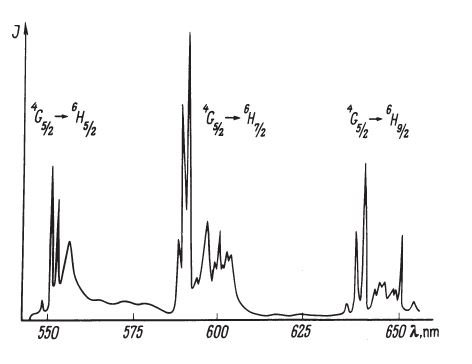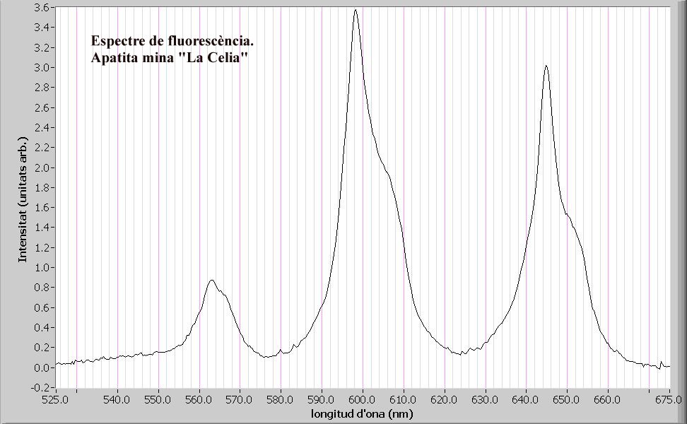 L’apatita de la mina La Celia té una fluorescència taronja amb el làser de 405 nm, amb una vida mitjana d’1,5 mil·lisegons (figura 5). Aquesta durada suggereix un element de les terres rares com a responsable de la fluorescència. L’espectre de fluorescència del mineral (figures 6 i 7) mostra uns senyals característics del Sm3+ (estan desdoblats ja que el Sm substitueix al Ca i en la xarxa cristal·lina de l’apatita hi ha dues posicions de Ca no equivalents). Un cop més, les observacions espectroscòpiques es correlacionen amb les de durada de l’emissió de fluorescència.