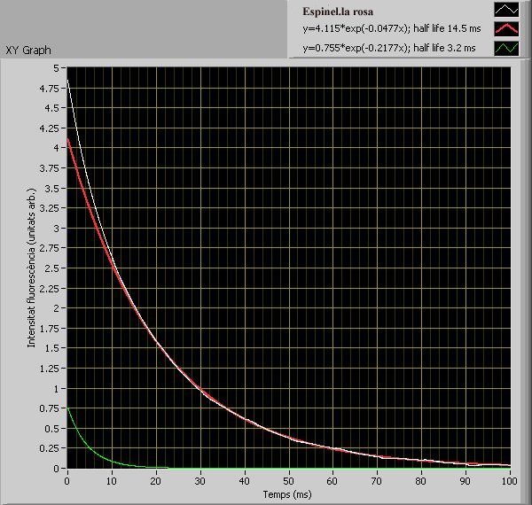 L’espinel·la rosa conté Cr3+, que dona lloc a una fluorescència vermellosa amb una emissió que majoritàriament està dins la regió de la radiació IR. L’emissió de fluorescència té dos components: un, amb una vida mitjana de 14.5 ms, i un altre, menys intens i amb una vida mitjana més curta, de 3,2 ms (figura 8). Quan hi ha més d’un responsable de la fluorescència i les vides mitjanes són prou diferents, no es pot aproximar una única funció exponencial a tota la gràfica. Es pot buscar, en primer lloc, l’exponencial que correspon a la durada més llarga i, restant-la del senyal original, es pot determinar a continuació la vida mitjana que correspon a l’element amb una vida mitjana més curta.