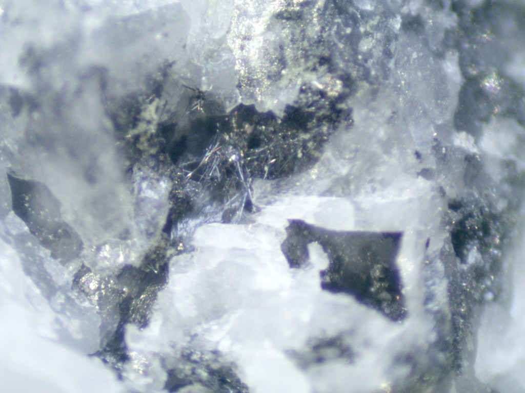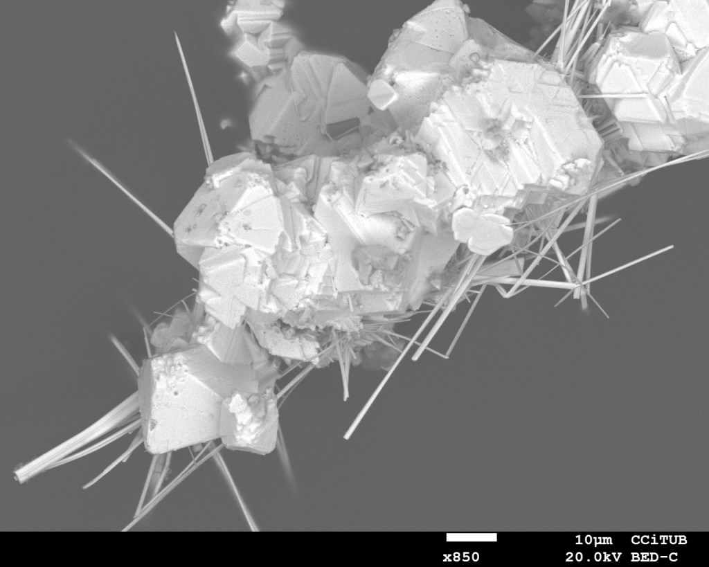 Es poden diferenciar dues morfologies d’agulles diferents: per una banda trobem unes agulles grises sempre agrupades en clústers desordenats, de fins a un mil·límetre de llargada i unes micres de gruix. Per altra banda, apareixen agulles bastant més petites, de fins a 50 micres de llargada i sobre una micra de gruix, sempre aïllades i que creixen sobre els petits octaedres de galena i orientats perpendicularment a la cara de contacte de la galena.