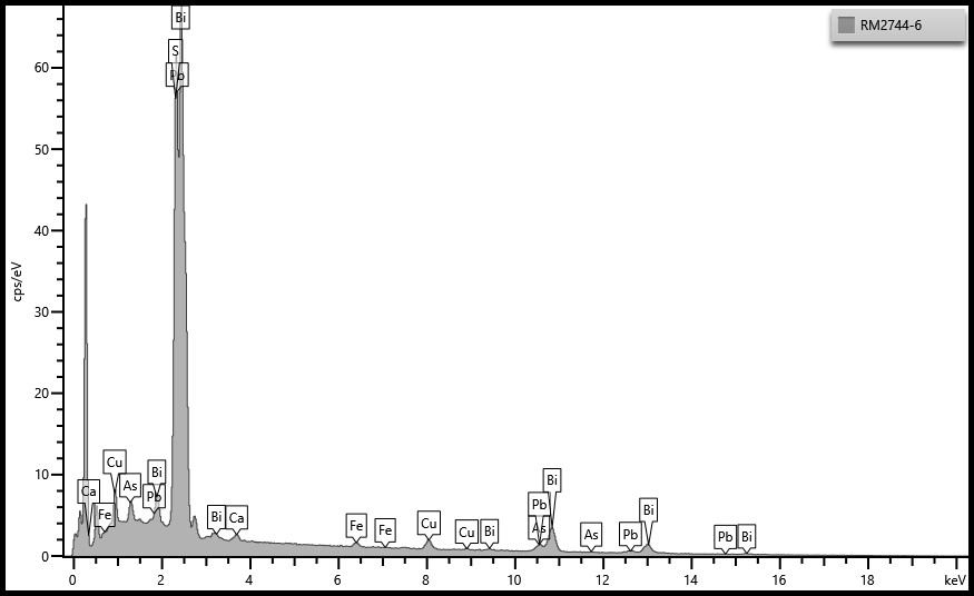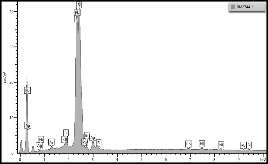 Abans d’entrar en les proves analítiques realitzades, és important destacar la dificultat que entranya la determinació exacta d’aquestes dues sulfosals. Totes dues tenen en comú que són sulfurs on el catió majoritari és el bismut. Però junt amb el bismut apareixen, en una quantitat variable, altres elements metàl·lics amb els que acostuma a combinar-se el bismut, fonamentalment Pb, Ag i Cu. Existeixen 49 sulfurs de bismut aprovats per l’IMA (International Mineralogical Association) en els quals el bismut es combina amb algun d’aquests elements (Pb, Ag i Cu). Però el més destacable és que en aquests moments hi ha en estudi unes altres 46 possibles noves espècies amb aquestes característiques, cosa que demostra la complexitat per a determinar aquestes espècies minerals. Un altre aspecte rellevant relacionat amb la dificultat en la determinació és el fet que és molt freqüent que en el mateix jaciment es trobin associades estretament un bon grapat de sulfosals del mateix grup o sèrie i que, fins i tot, és habitual que anàlisis fetes en diferents punts d’un mateix cristall donin espècies diferents. A aquesta variabilitat dels components metàl·lics se suma la impossibilitat de realitzar proves RAMAN satisfactòries a aquestes sulfosals. Per tant, les proves més definitives constituirien, sense dubte, els DRX (difracció de raigs X), cosa que de moment és poc viable amb les quantitats de material trobat fins al moment. Degut als arguments anteriors, parlarem només de possibles espècies en base a les hipòtesis que es poden fer dels resultats obtinguts amb anàlisis EDS (espectroscòpia de raigs X d’energia dispersiva).