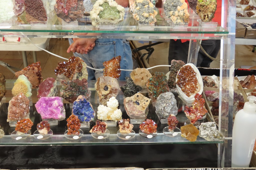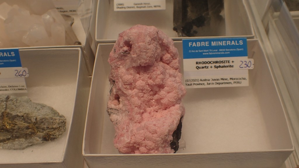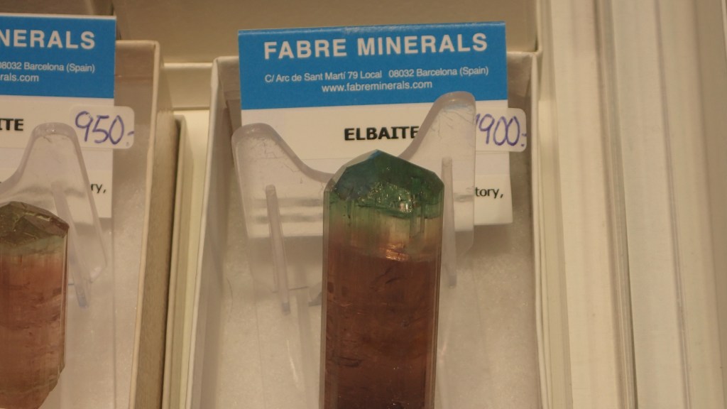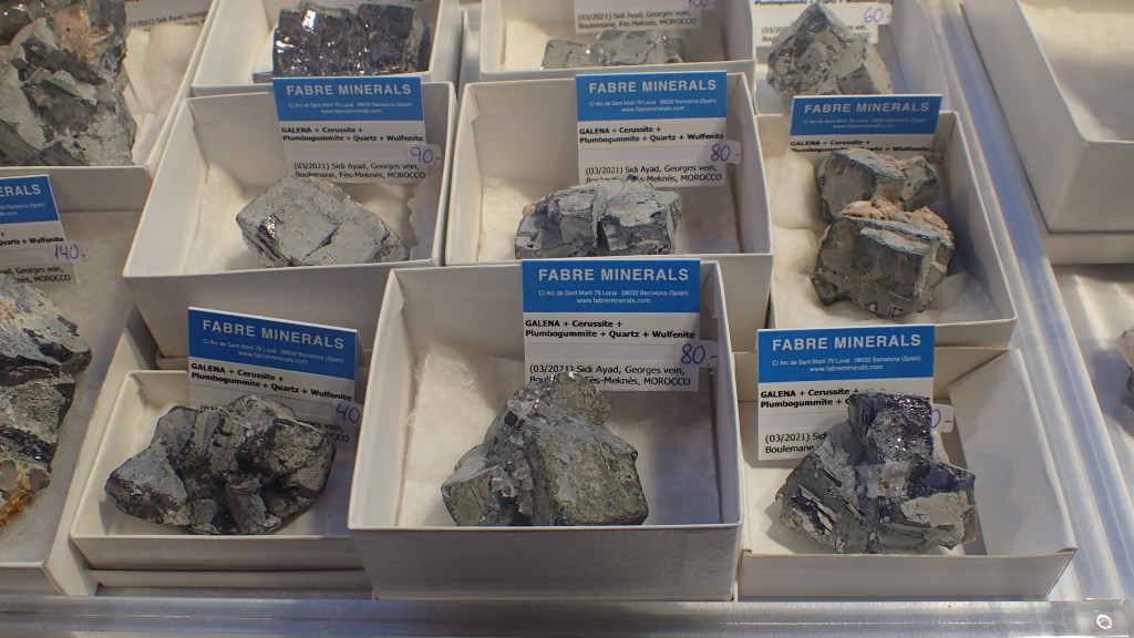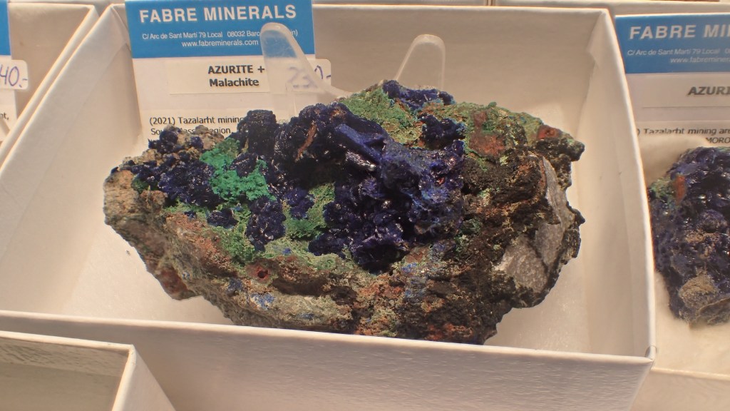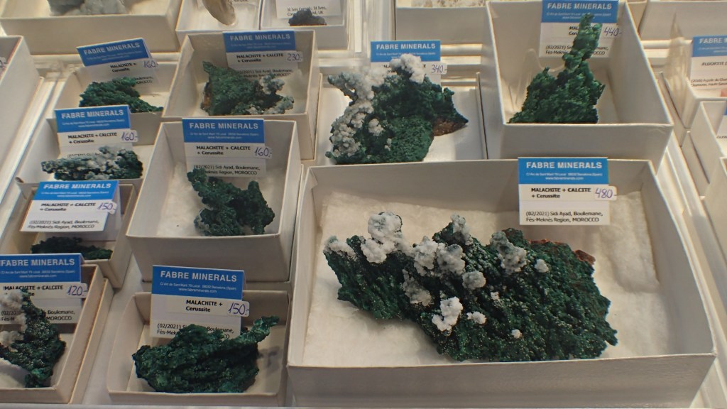 Pel que fa a les novetats, m’agradaria destacar les mostres de rodocrosita de la mina Austria Duvaz (Morococha, Perú), uns bonics exemplars de calcocita amb cristalls de gran mida de la mina M’Passa (Mindouli, República del Congo), així com mostres d’elbaïta de la mina de Rubaya, a la República Democràtica del Congo. A nivell peninsular destacaven unes boniques roses de calcita pseudomòrfica de guix de Rivas-Vaciamadrid (Comunitat de Madrid). Entre els minerals del Marroc també hi havia novetats, com ara unes mostres amb una bona paragènesi formada per galena, cerussita, plumbogummita, quars i wulfenita de Sidi Ayad; i de la mateixa localitat, malaquites amb calcita i cerussita. També del Marroc, or amb quars i pirita d’Aouint Ighoman o mostres d’atzurita amb malaquita de la zona de Tazalarht.