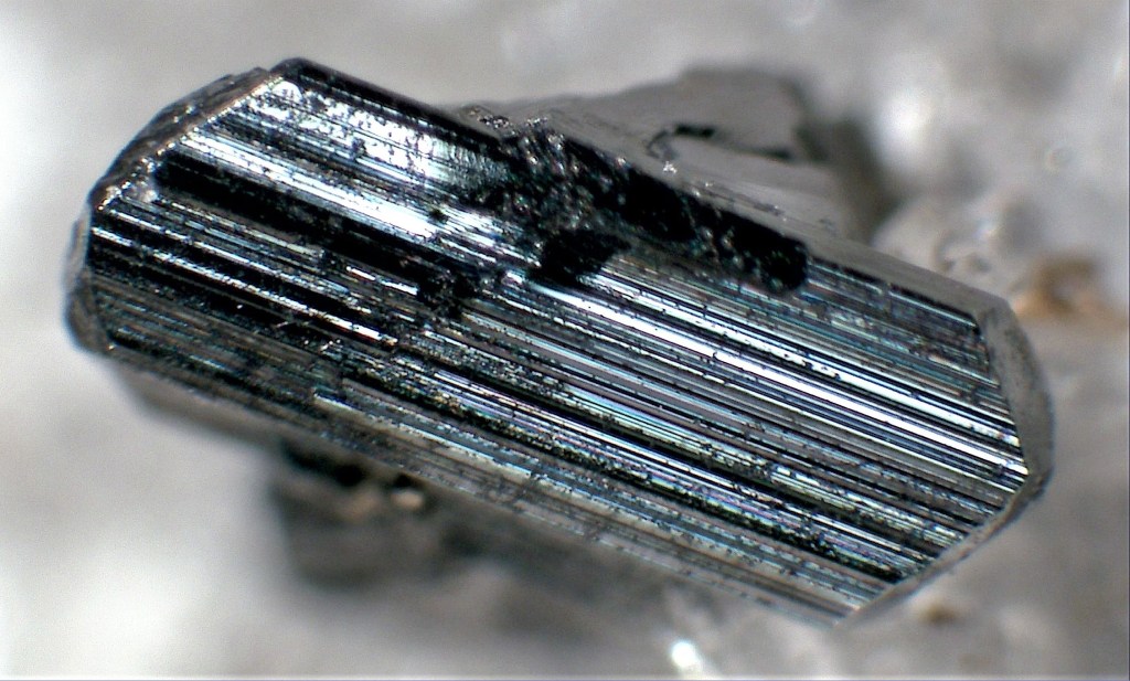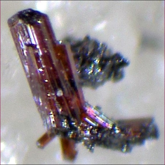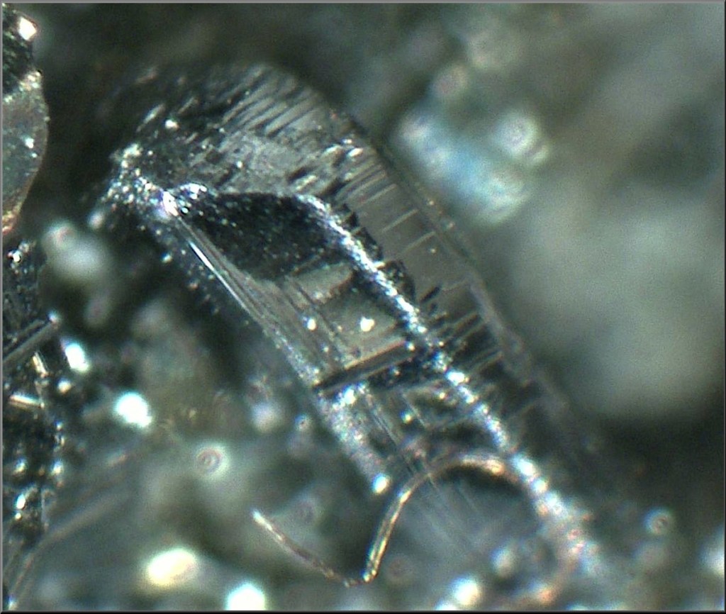 Es troba en prismes en forma de falca, negres i lluents, de fins a 2 mm de llargada i prop de 0,25 mm de gruix. Totes les cares del prisma estan estriades paral·leles a l’eix c. Les estriacions es produeixen probablement arrel del creixement alternatiu de les formes (100) i (110) o (hk0). Les cares terminals del cristall són únicament de la forma (0kl), ocasionalment estriades paral·lelament a l’eix més curt, és a dir, l’eix a.