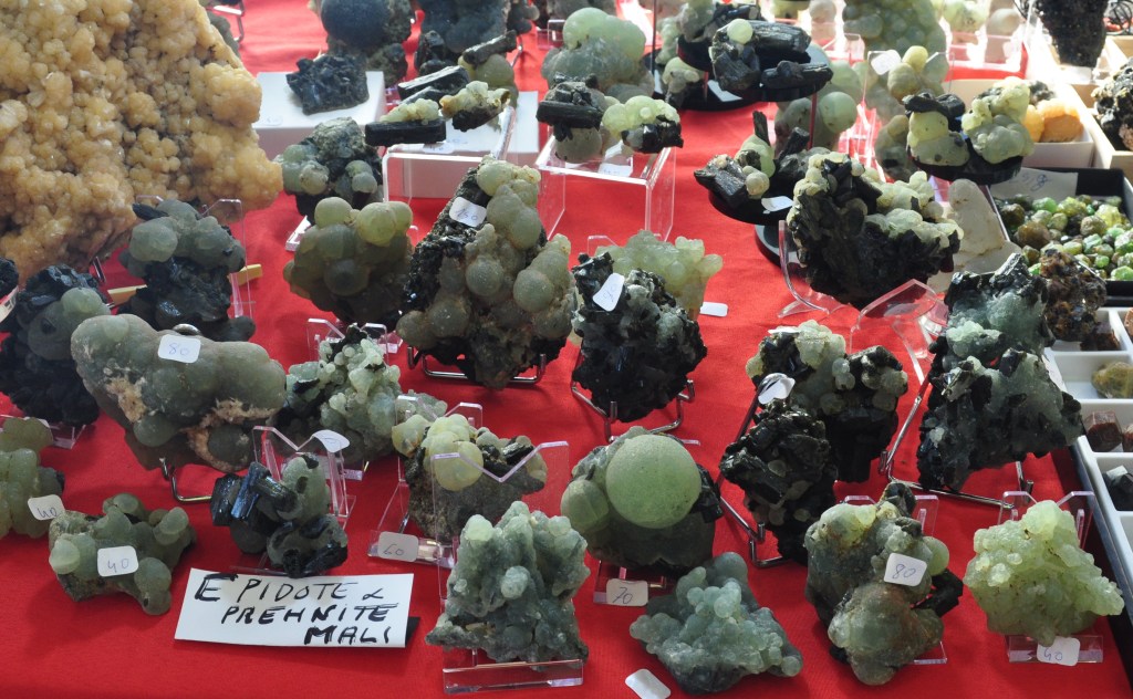 La taula de la Sra. Aminata Nakoumandrau, nativa i importadora de minerals de Mali, mostrava interessants peces de prehnita i epidota d’aquest país (foto 2).