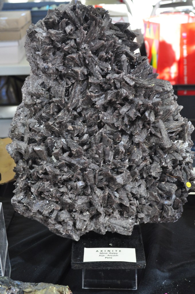 A la taula d’en Jean Pierre Turc, importador de minerals del Perú, vam poder gaudir de moltes peces de pirita, però destaquem una extraordinària axinita de la mina Raipa, província d’Aija, al departament d’Ancash (foto 8), així com un espectacular cristall d’hübnerita de 4 cm, en matriu de quars (foto 9).