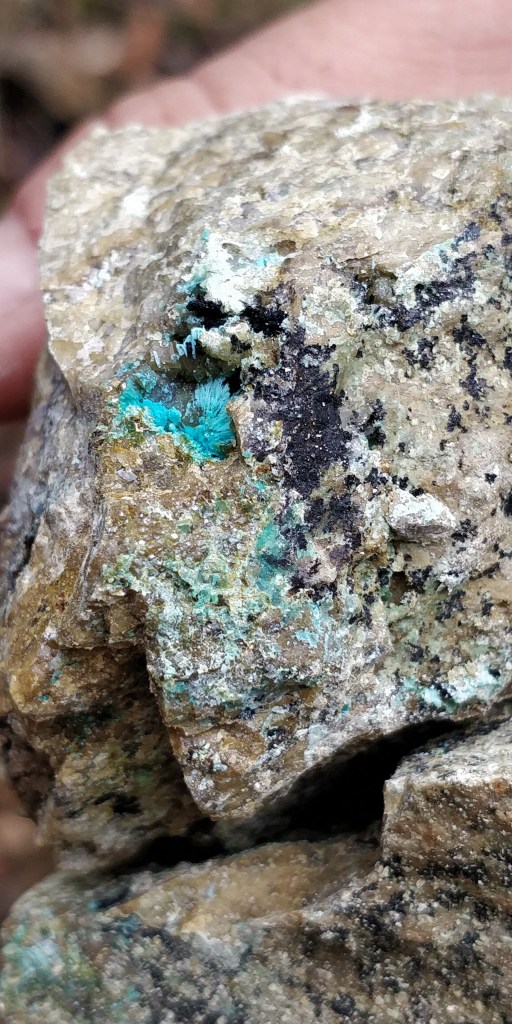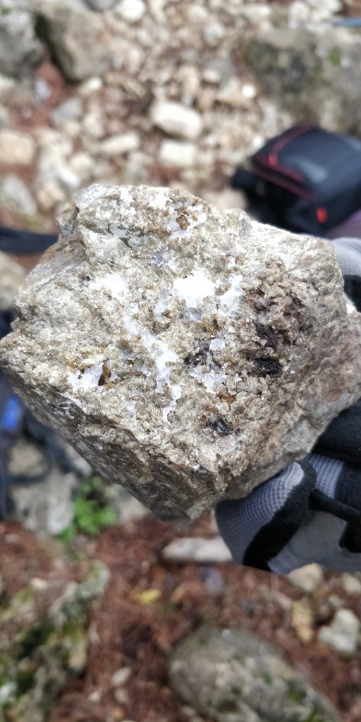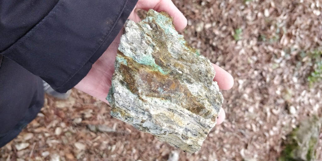 Amb aquests coneixements vam prosseguir la caminada fins arribar a peu del jaciment, moment en què ens vam enfilar muntanya amunt camp a través per arribar a la zona dels pous. Les labors estan abandonades des de fa dècades, però ha estat un punt habitual per a una part dels aficionats a la mineralogia d’aquest país, per la qual cosa trobar bon material és cada cop més complicat. Darrerament, vam poder comprovar que algun dels últims visitants havia malmès la zona, descavalcant alguns arbres per a esmicolar la roca.