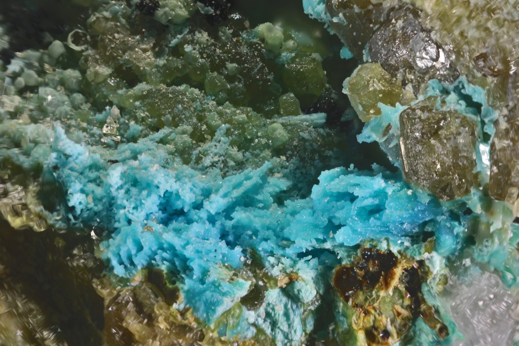 Mentre una part del grup explorava els terregalls a la recerca de bon material, la resta observava els pous i entrades. Val a dir que l’indret revesteix cert perill si no es va amb precaució, si bé està tot degudament senyalitzat i advertit. No era intenció en aquesta sortida accedir a cap de les boques, pel que no es van prendre ni cascs ni frontals. I certament, era més prudent aquesta opció. Remenant entre les roques vam passar unes tres hores. Tothom va poder recollir mostres de granats i vesuvianites, i també d’atzurita i malaquita, d’aquestes quatre en abundància. Altres mostres més minoritàries també van caure al sarró. En Marc, amb paciència, resolia els dubtes que sorgien al voltant de la identificació dels minerals i orientava sobre les millors zones on cercar. Curiosa també va ser la manera de descobrir magnetita, això sí, massiva, amb un potent imant.