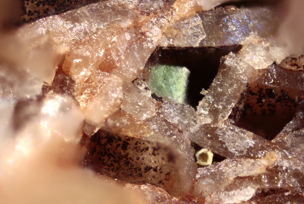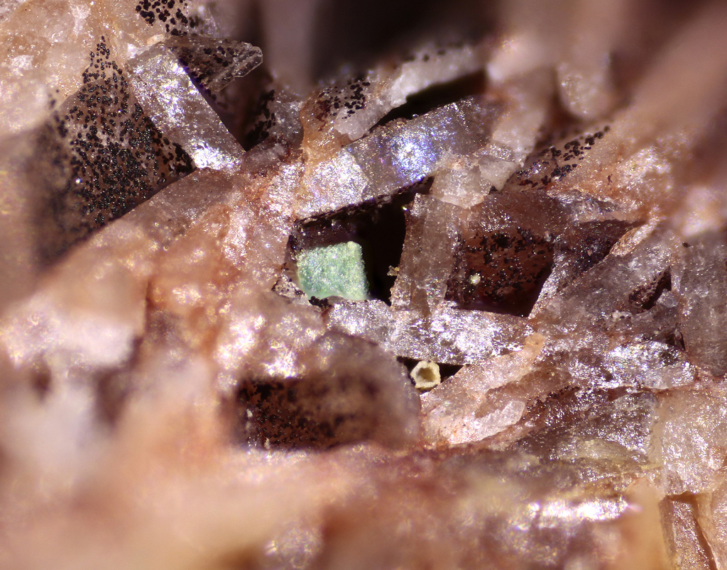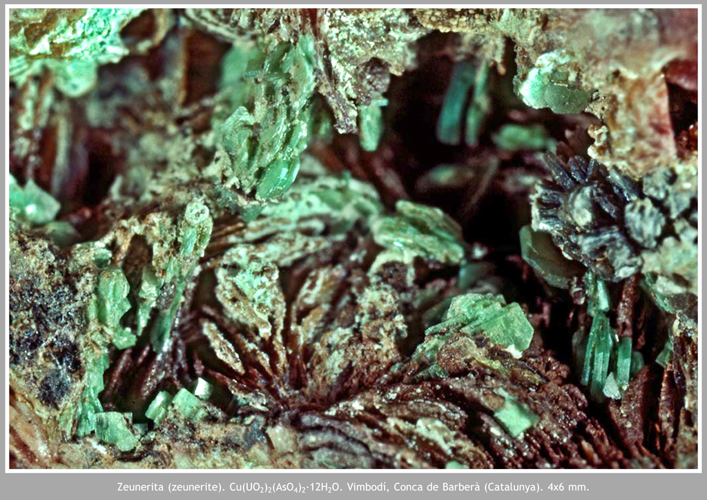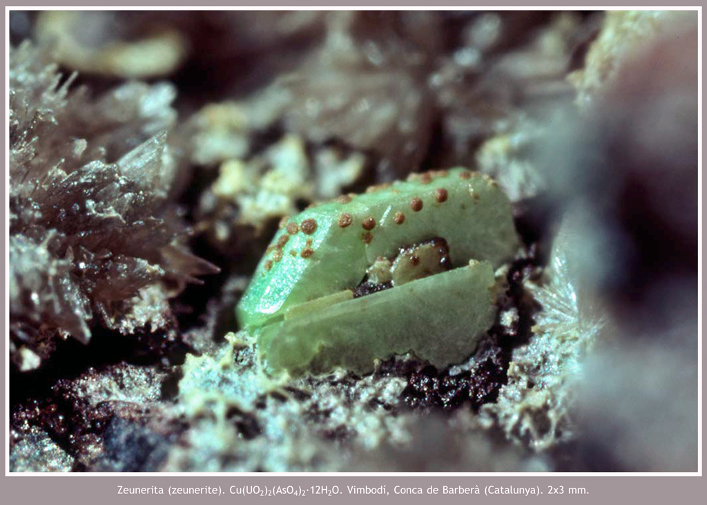 En la imatge que il·lustra l’article (figura 1) observem un grup de cristalls d’aspecte tabular, pseudohexagonals, de color verd poma amb petits glòbuls de color marró, identificat com a kahlerita-zeunerita. Per a arribar a aquesta conclusió es presenta un espectre EDS on podem veure: arsènic, urani, coure i ferro.