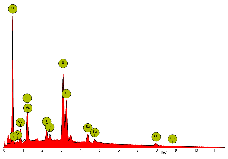 Mitjançant espectroscòpia SEM-EDS hem obtingut una composició en la que el ferro no es detecta (figures 6, 7 i 8). La composició és coherent amb metazeunerita. Però també observem que en els resultats apareixen bari i sofre.