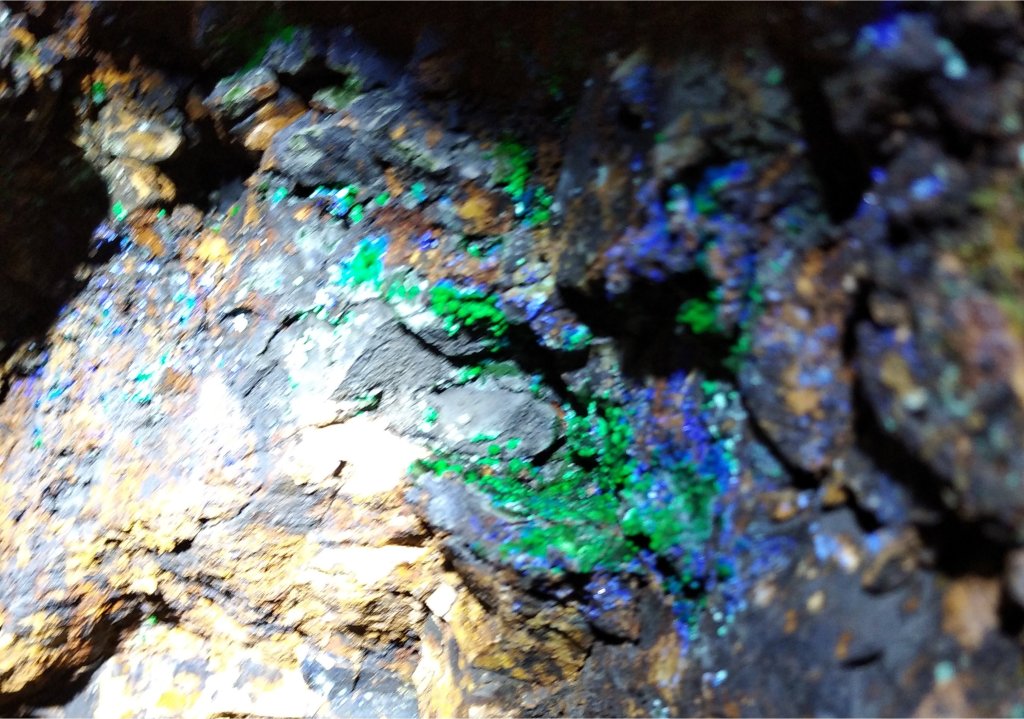En las muestras analizadas de esta mina también se ha verificado, además de presencia de azurita, la de cornwallita y conicalcita. Los espectros Raman de los minerales de color verde, que forman bolas minúsculas, a menudo recubriendo a la azurita, corresponden a cornwallita en aquellas zonas de un color verde similar al de la malaquita. Las costras de color verde oliva han resultado ser conicalcita. Otras costras de color verde manzana brillante contienen una mezcla de conicalcita y cornwallita.