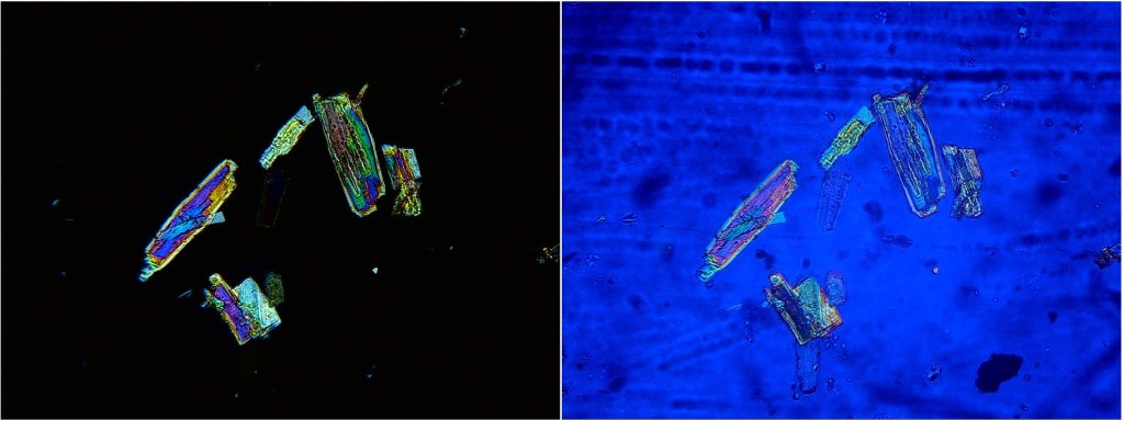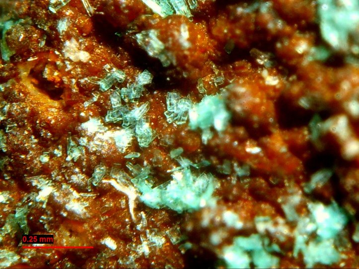 En el binocular se observa que el mineral está formado por pequeños listones apilados de un modo desordenado. Con el microscopio, a 90 aumentos, se observan mejor los listones, muy delgados y de color verde azulado (figuras 4 y 5). En las muestras estudiadas los cristales tienen una longitud que raramente supera las 100 micras (0,1 mm).