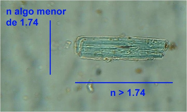 En el microscopio petrográfico, con la lámina de cuarzo, se ha comprobado que su elongación tiene signo positivo (figura 6). En un líquido de inmersión con índice de refracción 1,74 se ha verificado que el índice de refracción del mineral en la dirección del alargamiento de los prismas es claramente superior a 1,74 mientras que en dirección perpendicular es algo menor de 1,74 (figura 7). La birrefringencia es alta y se observan colores de interferencia en el primer y segundo órdenes (figura 6); gris en los cristales pequeños y verde en los cristales mayores. La extinción es recta y la figura de interferencia corresponde a un mineral biáxico pero la orientación de los cristales no ha permitido encontrar ninguna figura en la que se pueda determinar claramente el signo óptico. No se ha observado un pleocroísmo destacable: los cristales mantienen el mismo color verde azulado en la rotación de la platina.