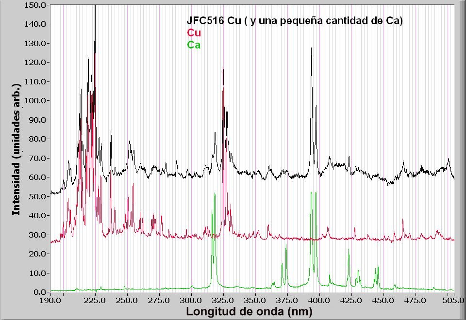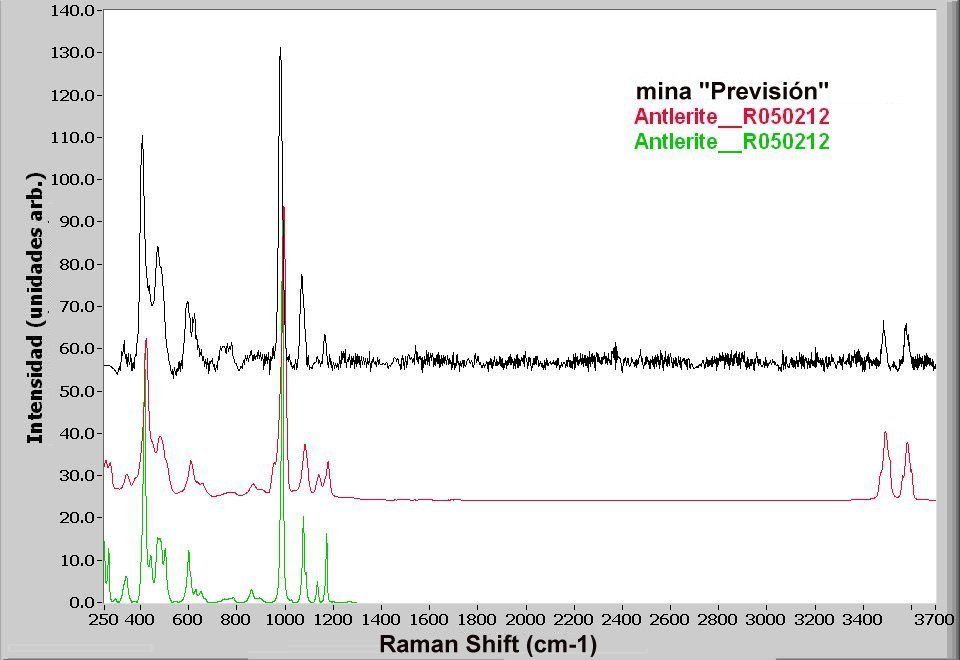 Las propiedades ópticas que se acaban de indicar, por sí solas, no permiten identificar el mineral. Afortunadamente, su espectro Raman es relativamente intenso (figura 8) con la señal principal en la posición que corresponde al modo de vibración (stretching simétrico) del grupo sulfato, a 981 cm-1, y señales estrechas de vibración de OH a 3484 y 3578 cm-1. Este espectro es característico de la antlerita (Frost et al., 2004), tal como se ha podido confirmar en la búsqueda dentro de la base de datos RRUFF. En el análisis mediante LIBS (figura 9) se ha confirmado que las únicas líneas espectrales que aparecen en la región del UV corresponden a cobre (también se observan las líneas del Ca, relativamente débiles, muy probablemente debido a impurezas).