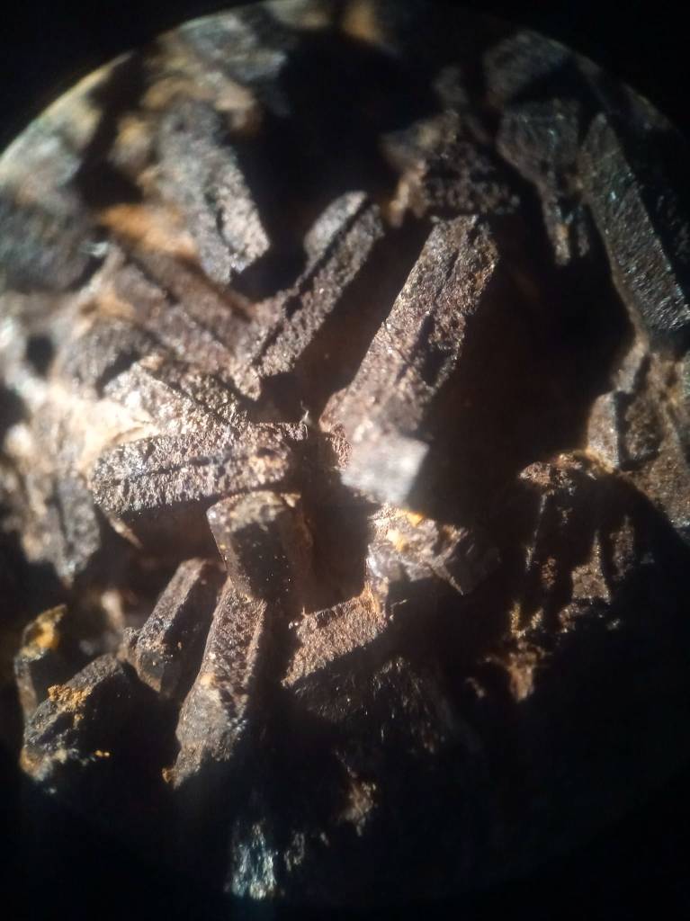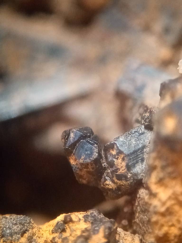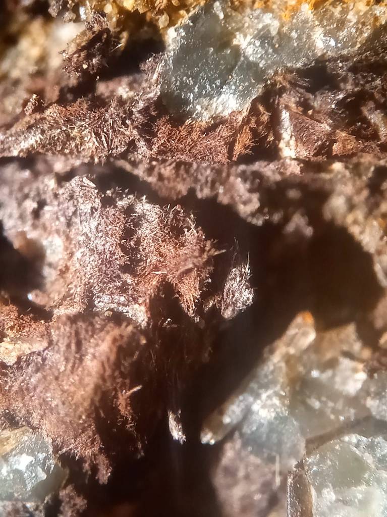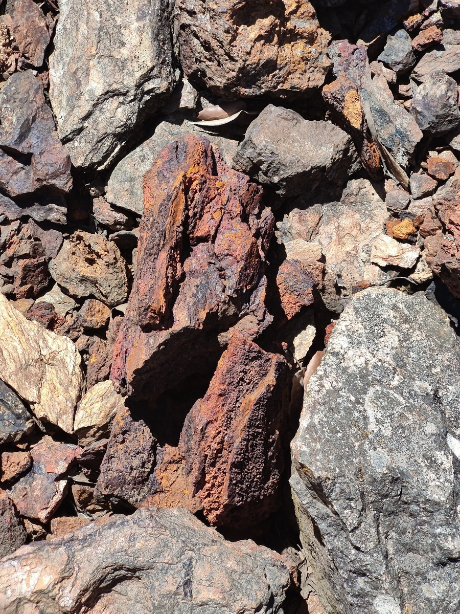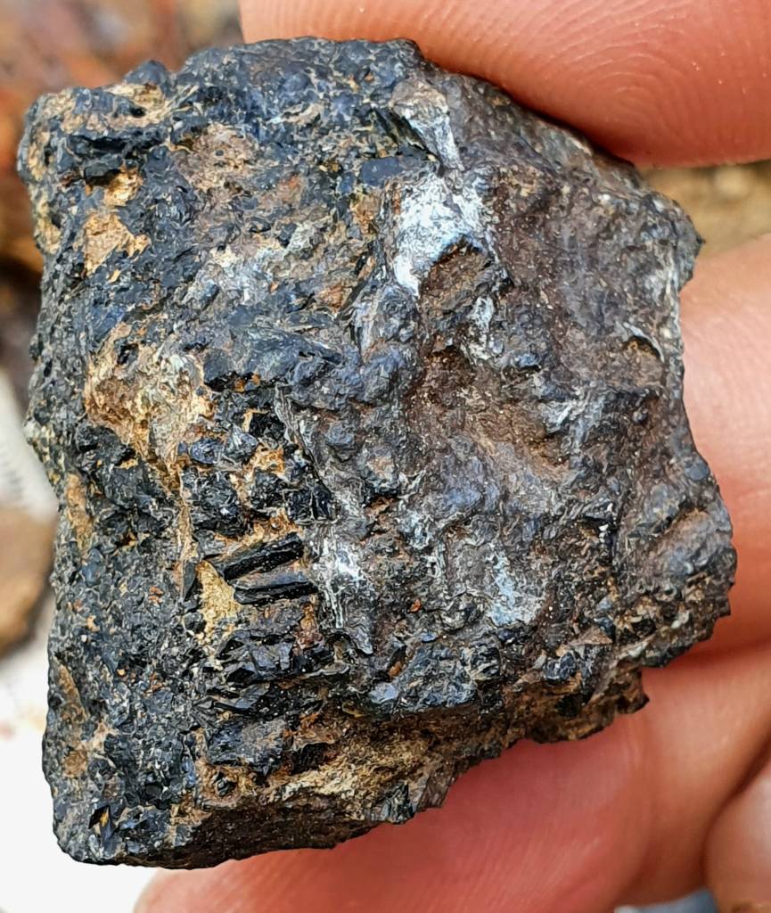Després d’una bona estona picant i seleccionant el material, vam traslladar-nos a la zona de Can Llavor, on presumiblement hi hauria hagut activitat extractiva. Tot el marge dret de la pista era conformat per un terregall prou extens, format per una mena de “gossan” i on la vegetació havia respectat el lloc. Vam poder gaudir d’una experiència interessant: amb imants, va ser ben fàcil recollir les mostres de magnetita (massiva, això sí) que es trobava dispersa. També s’hi barrejava pirrotina i algun altre mineral metàl·lic. Els més abundosos, però, eren aquests citats. Limonita, hematites i goethita complementaven la paragènesi visual, donant unes tonalitats de colors ocres i vermellosos. Algun petit fragment, amb la llum del sol directa, oferia reflexos irisats.