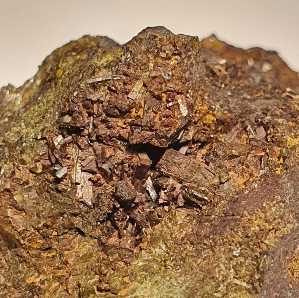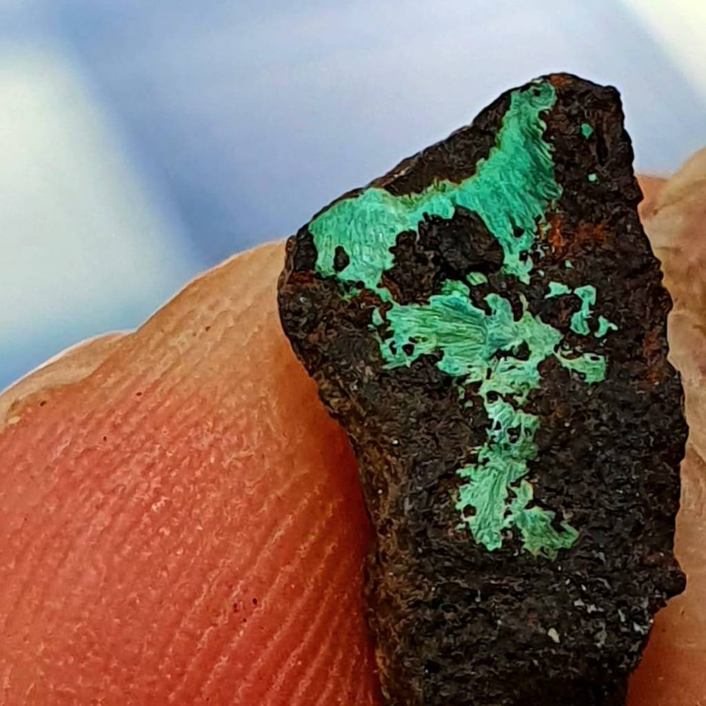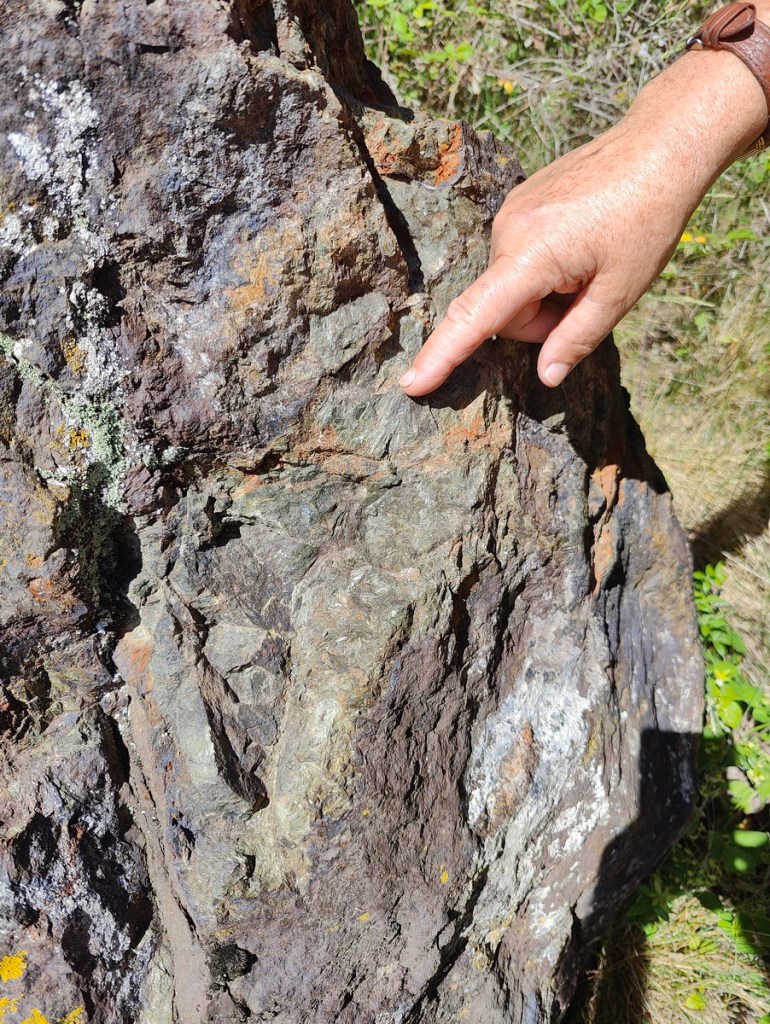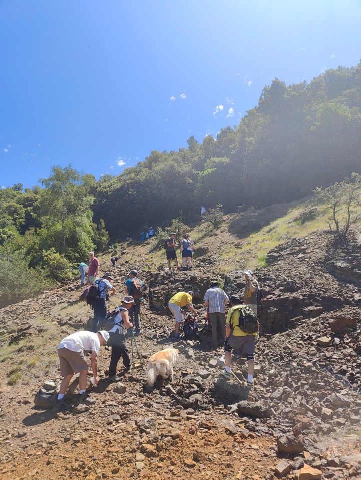 Tornant al que va ser la sortida, al Puig del Pedró, aflorament natural, es va fer tota l’explicació. D’allà estant, vam veure les labors del paratge del Torn, on s’hi havia trobat material metàl·lic. Es van poder recollir un bon grapat de mostres d’hedenbergita, el mineral més comú i abundant, que apareixia en feixos molt definits. En funció del grau de meteorització es presenta en tonalitats verdes o més fosques. Amb paciència i constància, es va trobar també alguna mostra de possibles augites, ben curioses, ja que el seu origen metamòrfic és diferent de les habituals del volcà de Roca Negra, per exemple. De tant en tant apareixien alguns metalls entre els feixos.