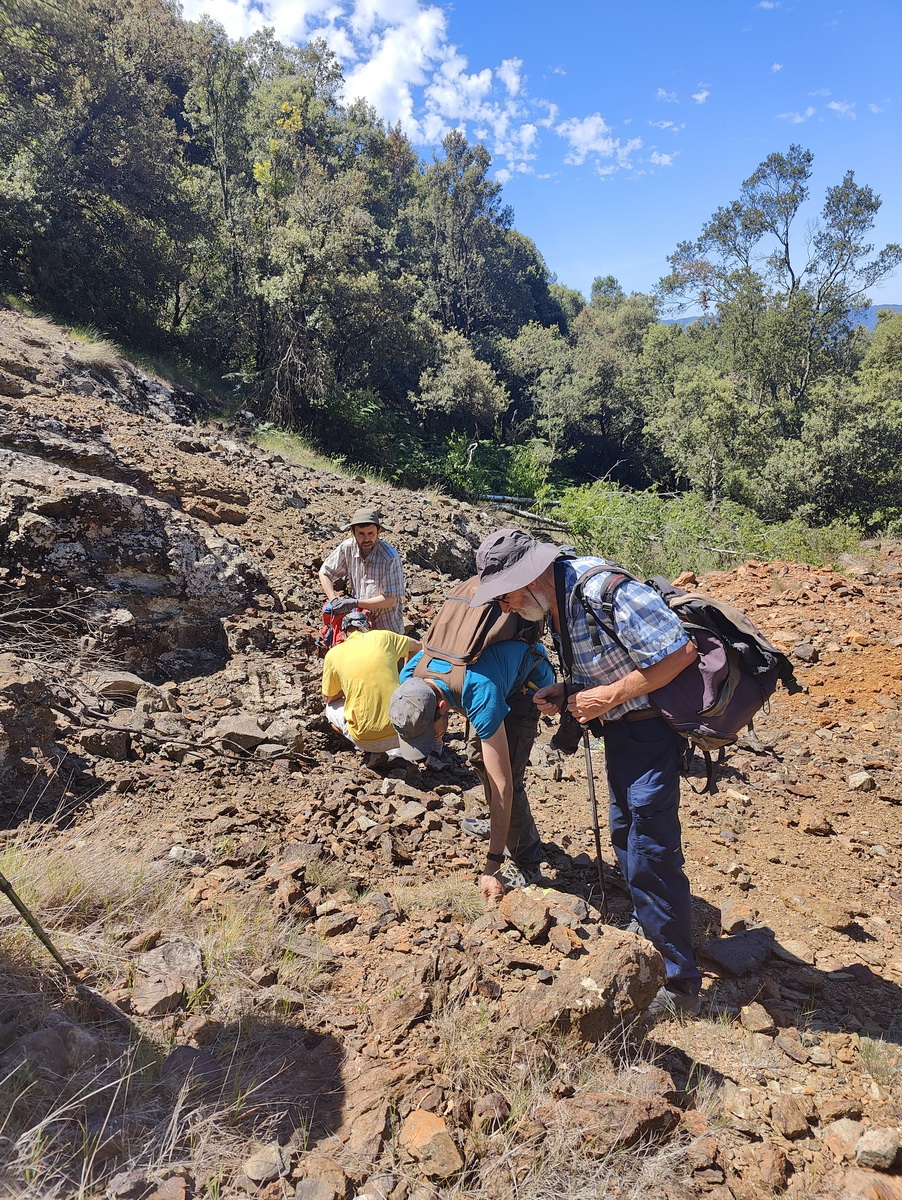 Ja propers al migdia, cap a la una, els assistents van anar retirant-se esglaonadament. Val a dir que la calor apretava i ja s’havia pogut recollir per part de tothom un bon grapat de mostres representatives. Aquesta retirada va ser on es va produir l’anècdota, o millor incidència, de la jornada. Malgrat els vehicles que es van utilitzar per a accedir al jaciment estaven preparats per a circular per pistes de muntanya, al camí hi havia un bon nombre de rocs i pedres i un dels cotxes va punxar; i ben punxat! Ai làs! Tots els cotxes del darrere van quedar atrapats, afortunadament no n’eren massa, i va començar la segona part de la sortida: convertir-se en mecànics, i fer un canvi de roda en una superfície inclinada i irregular! Amb la participació de tothom l’empresa va reeixir exitosa i tothom va poder retornar a casa sa i estalvi!!!