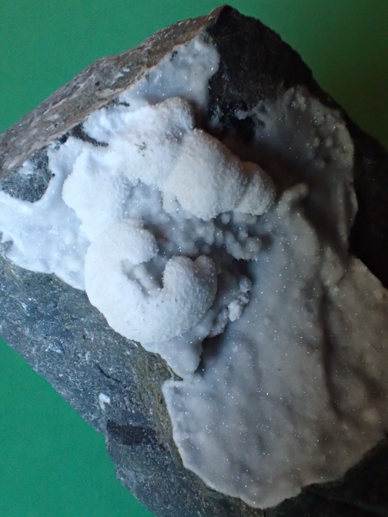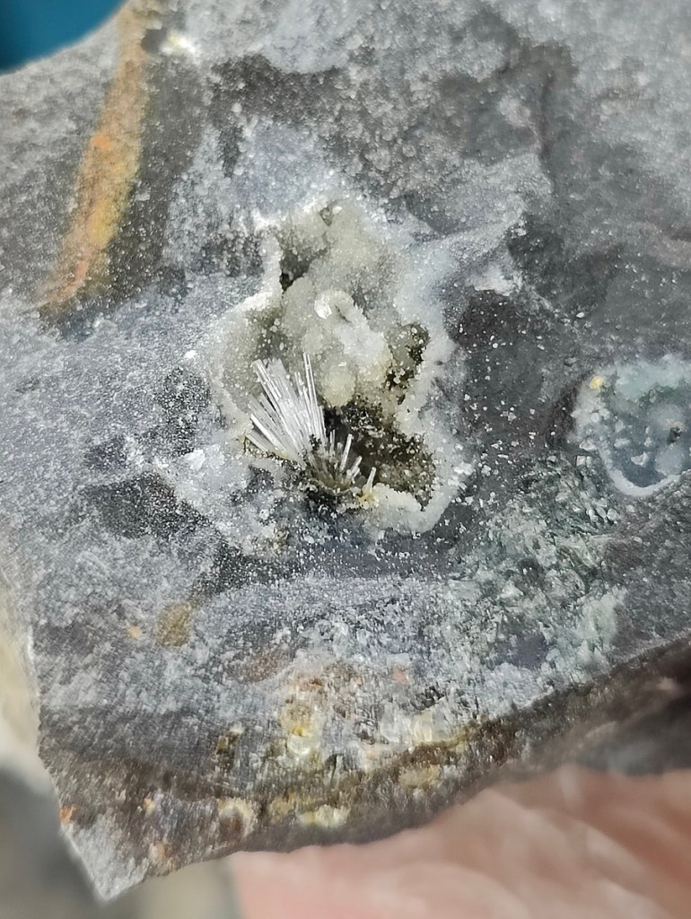 Cal destacar que en comparació a ara fa un any, la pedrera estava molt canviada i hi havia hagut molt de moviment. Com en anteriors excursions, el ser força colla va fer que aviat apareguessin els minerals més característics de la zona, que es troben a l’interior de vacúols dins del basalt. Unes de les espècies més característiques és la phillipsita que, a Can Savoia, apareix molt ben cristal·litzada i és fàcil de distingir amb la lupa. També altres zeolites com la mesolita i la natrolita, molt més difícils de classificar a ull nu. A més de les espècies citades també es van trobar cristalls d’aragonita molt ben desenvolupats; això sí, es va haver de picar amb moltes ganes ja que la duresa dels basalts va fer suar de valent als que volien obtenir una recompensa en forma de mostra per a la col·lecció.