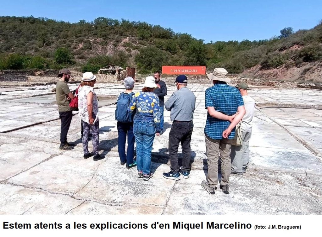 En Miquel, qui ens fa de guia d’aquest espai tan singular, inicia l’explicació amb un repàs històric sobre l’explotació de les aigües salades que s’acumulaven de manera natural en aquesta petita depressió on ens trobem, des de la prehistòria fins a l’actualitat, on tots els períodes de conreu de la sal hi han deixat la seva empremta en forma de lloses de diferents materials amb que es pavimentava el fons de les basses de precipitació de la sal: argila, calcàries taulejades, i ciment. Aquestes salines van estar actives fins l’any 1978.