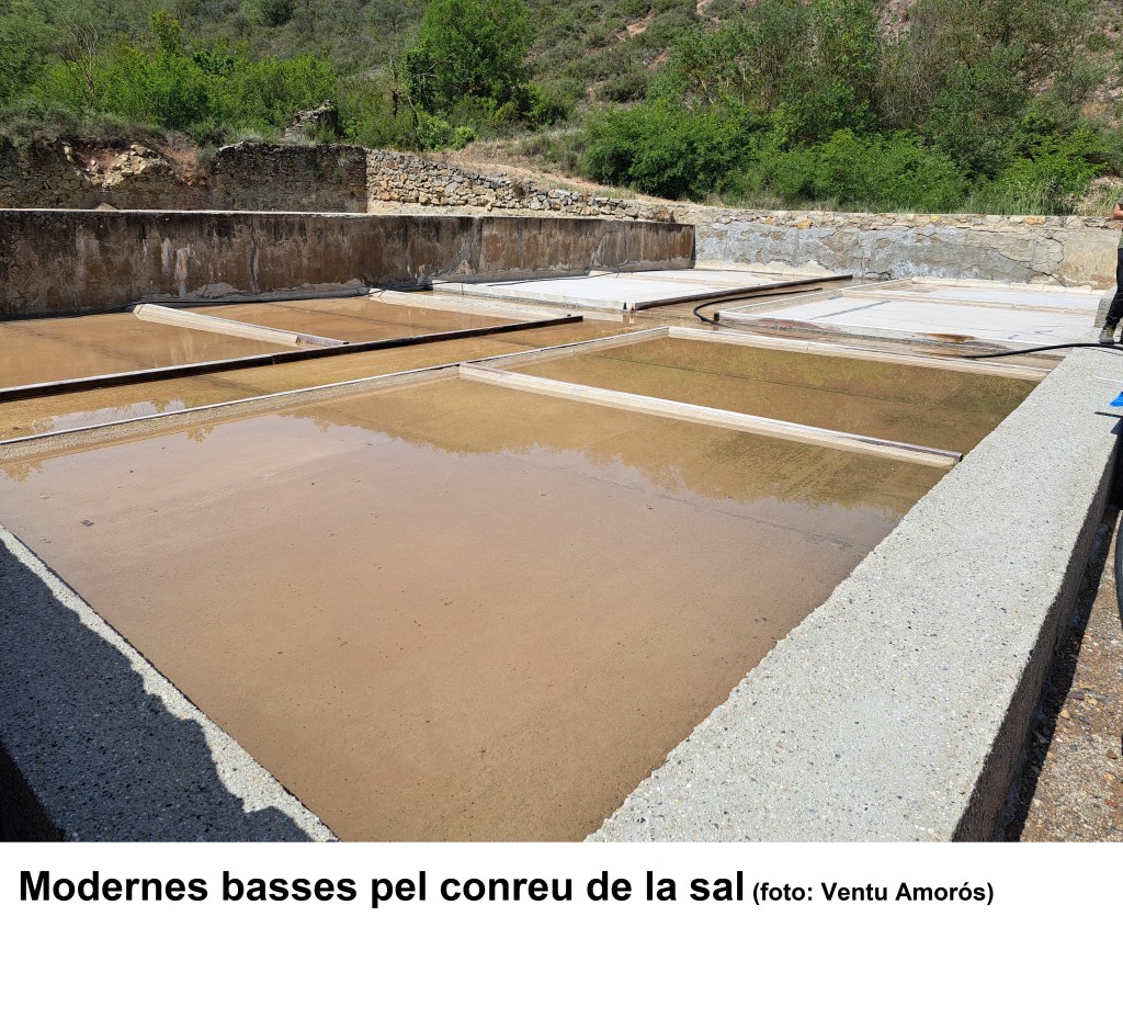 Tanmateix, i per acabar la seva explicació, en Miquel obre l’aixeta de l’aigua salada, la qual corre per damunt un canaló de fusta, l’únic material que no es deteriora, i va a parar a una de les basses de demostració del conreu de la sal. Tots ens afanyem a tastar l’aigua, que està supersalada! En Miquel ens diu que, fins ahir, en aquesta bassa hi havia una muntanyeta de sal que s’estava assecant, però que les pluges de la nit l’han dissolt de nou…llàstima! Les salines d’interior van entrar en decadència a partir dels anys 50 amb la comercialització del gel industrial com a mètode de conservació dels aliments.