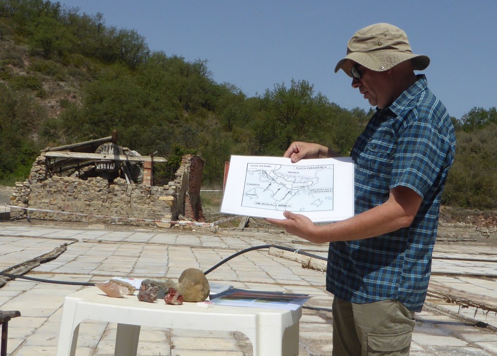 També, amb l’ajut de mapes i esquemes, ens explica el per què es troba sal tan lluny de la costa… I és que estem damunt l’anomenat Diapir de les Avellanes, una gran concentració d’evaporites (sals i guixos) de la fàcies Keuper (del Triàsic) formats durant l’obertura de l’oceà Atlàntic i acumulats pel moviment cap al sud dels mantells de corriment durant l’aixecament dels Pirineus. En Carles ho exemplifica dient que un diapir és com si fos un gra enorme que rebenta l’epidermis de la Terra. I també ens fa reflexionar sobre si ens trobem al Prepirineu o al Pirineu: i és que geogràficament estem al Prepirineu, però geològicament estem en ple Pirineu.