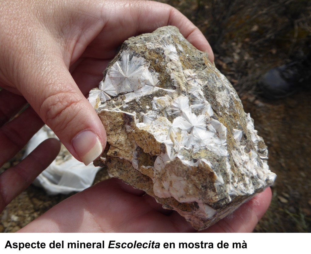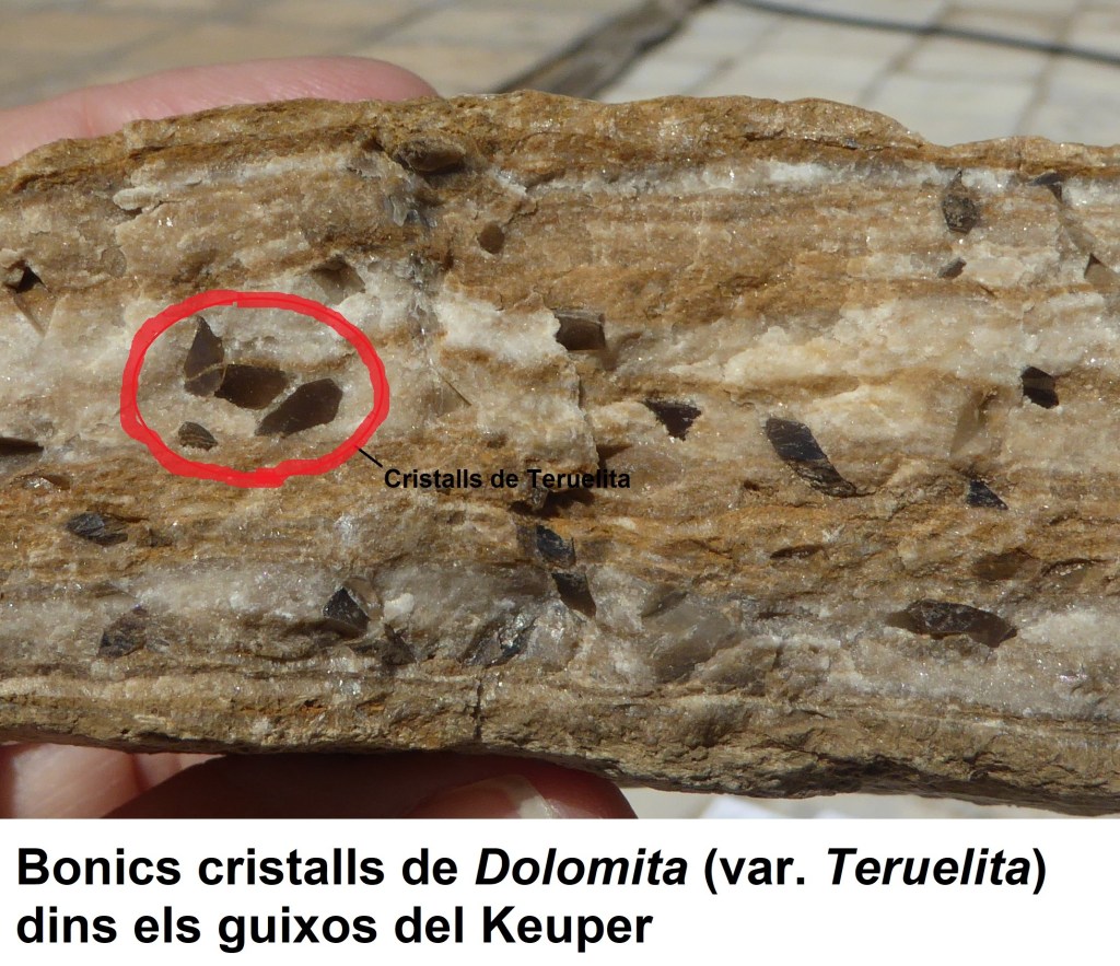 Acabades les explicacions, el company i geòleg Carles Manresa, amb l’ajut de boniques mostres de mà, ens fa cinc cèntims dels materials que formen el Triàsic (el primer període del Mesozoic o Era Secundària), així com també d’alguns minerals que podem trobar per aquests encontorns.