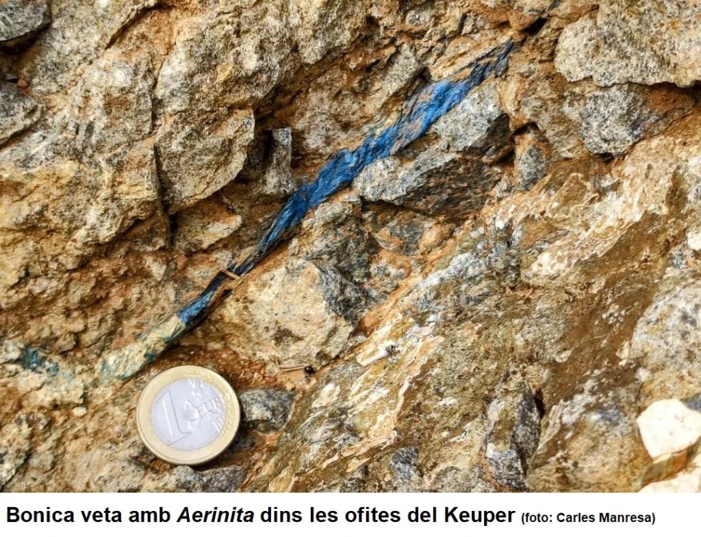 Després del magnífic dinar al restaurant Cal Jordi de les Avellanes, anem fins a Tartareu a cercar un mineral anomenat aerinita, nom que prové del grec aeros que vol dir “blau cel” i que es troba en forma de vetes entre les ofites, que són unes roques subvolcàniques que es diuen així perquè semblen la pell d’una serp i són un testimoni directe del trencament del supercontinent Pangea.
