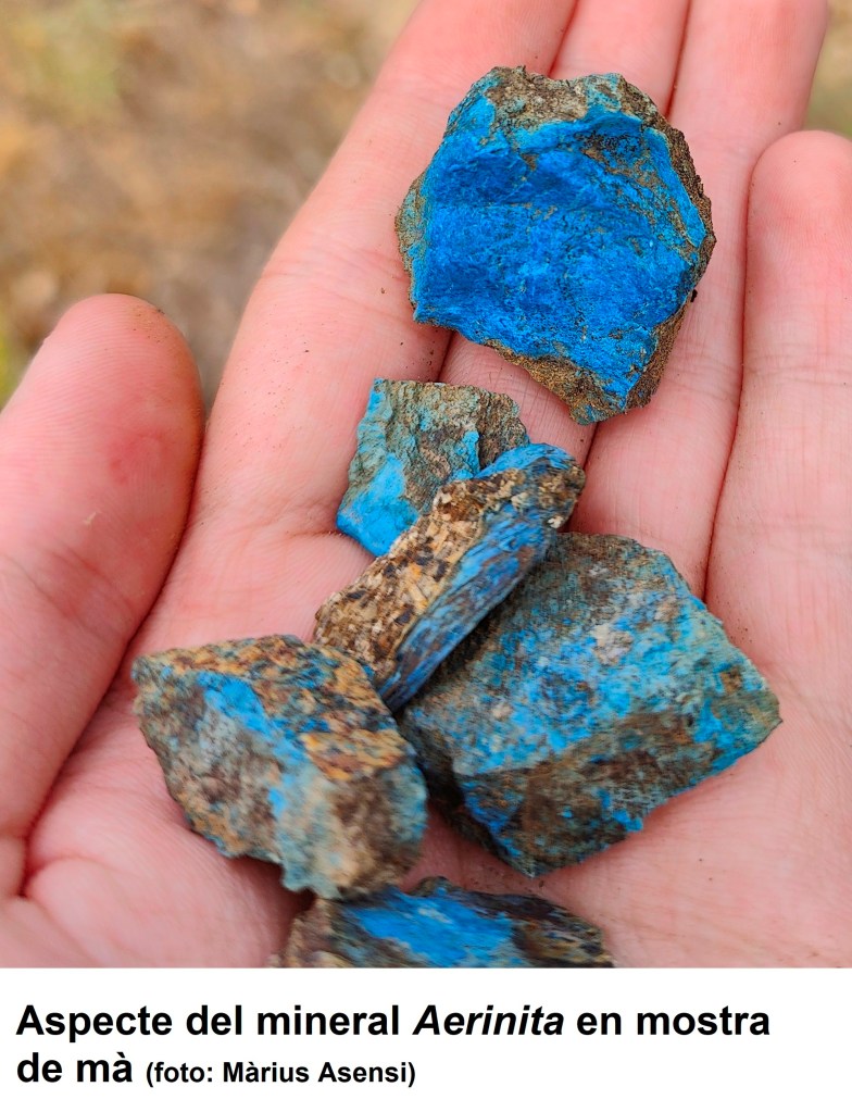 L’aerinita és un mineral del qual no es va saber la seva estructura interna fins l’any 2004! Era considerat un fil·losilicat i es va acabar classificant com a inosilicat. Va ser molt important a l’Edat Mitjana com a substitut de Km0 del blau de les pintures murals que proporcionava el lapislàtzuli procedent de l’Àsia. També en aquestes roques es pot trobar un altre bonic mineral anomenat escolecita, nom que també prové del grec skoleos que significa “cuc”; i és que quan s’escalfa, aquest mineral es recargola.