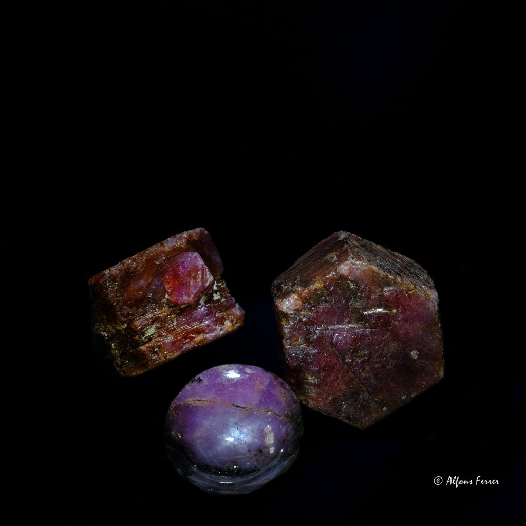 El rubí es una variedad del corindón y debe su característico color rojo al cromo. Los rubíes tienen una dureza de 9. Algunos rubíes presentan un asterismo o “estrella” de tres o seis puntas. Estos rubíes se tallan en cabujones para que se aprecie bien el efecto.