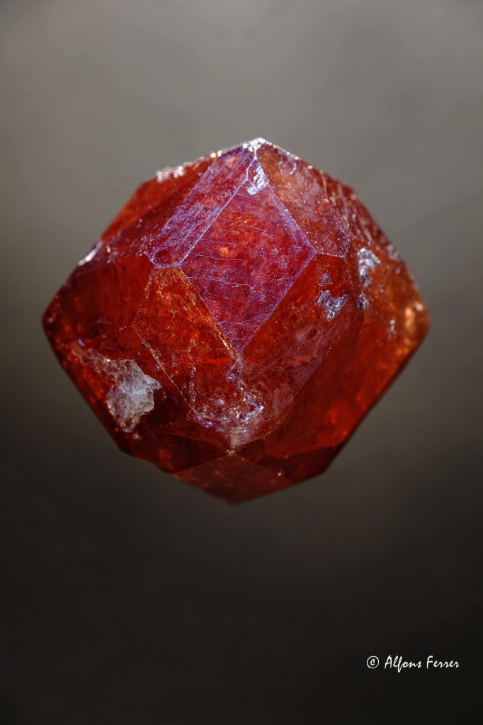 Su nombre viene de las montañas de Spessart, en Baviera, Alemania. Silicato de manganeso y aluminio. El manganeso es a menudo reemplazado por algo de magnesio y hierro. La spessartina es miembro del grupo de los granates y es conocida por sus colores estéticos naranja y rojo-naranja. En este yacimiento se hallan en cristales trapezoédricos individuales, a menudo bien desarrollados.