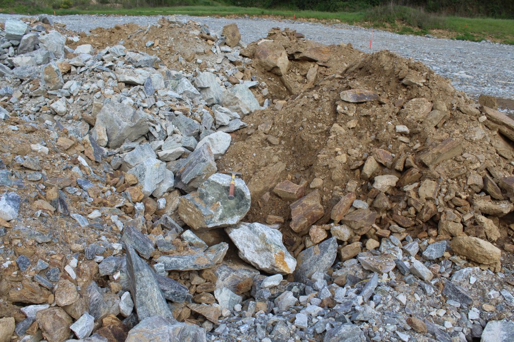 - Perforació del túnel. Es va fer des de la boca nord. Només al final es van obrir uns 30 metres des de la boca sud just abans de l’operació de calat. L’accés a l’interior del túnel durant les obres, lògicament, no era pas possible; per tant, només he pogut estudiar el material que s’extreia i s’acumulava a l’esplanada entre la N-141 i el polígon Riera Seca. En un primer moment tot eren esquistos terrosos, sense interès, i l’avanç de la perforació era molt ràpid. A partir d’un determinat moment es van tallar els marbres i roques calcosilicatades, fet que va obligar a utilitzar explosius i alentir l’avanç. Les roques extretes passen a ser de colors blancs i verdosos. Pel temps que va estar sortint aquest material i per la quantitat acumulada, intueixo que el nivell de marbres en el subsol és important, encara que els afloraments en superfície no ho reflecteixin.