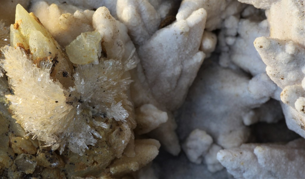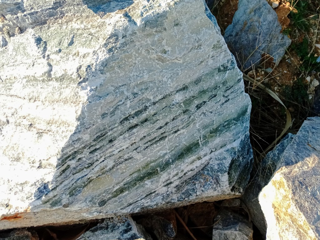 En els marbres i roques calcosilicatades podem trobar-hi silicats d’aspecte fibrós, possiblement wollastonita i hedenbergita. Les bandes d’aspecte més verdós en els marbres estan formades per diòpsid.