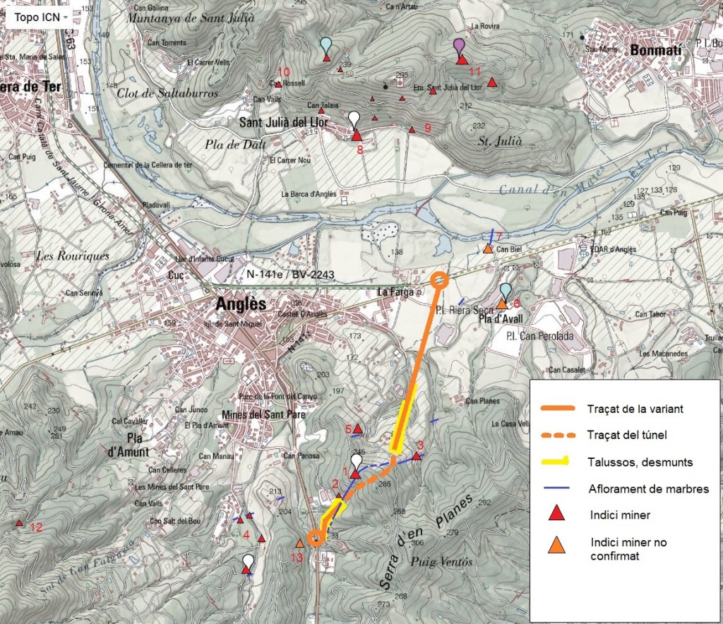 En aquest treball es reporten algunes troballes de minerals i afloraments apareguts gràcies a les obres de construcció de la nova variant d’Anglès. A més, l’estudi dels materials extrets durant la perforació del túnel, així com l’observació dels materials geològics en els talussos i terregalls d’obra, permet interpretar aquestes mineralitzacions, millorant alhora la comprensió de jaciments propers com les mines de Sant Julià de Llor i les mines del Sant Pare.