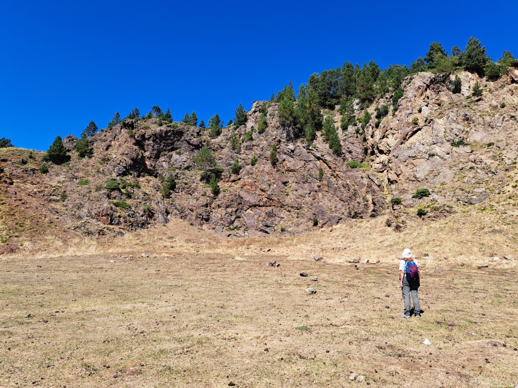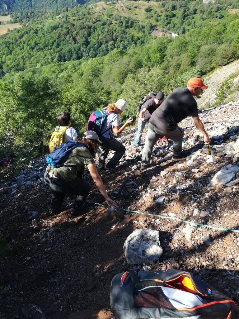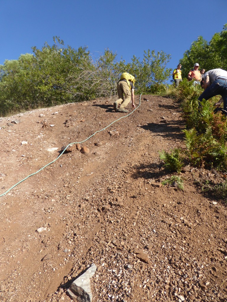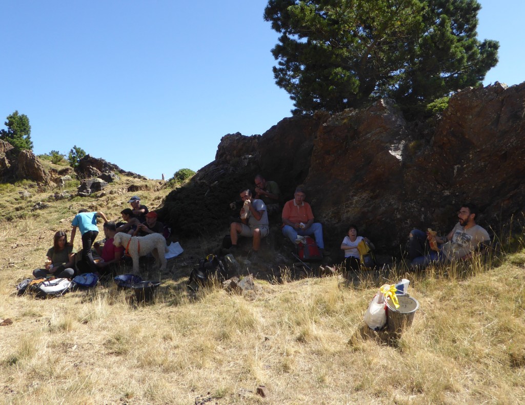 Aquí, a part d’hematites i alguns petits exemplars de goethita, els companys francesos han trobat també alguns filonets amb pirites. Damunt la gespa castigada per la sequera, sorprèn trobar bonics exemplars de carlines ben florides. I com que ja es una mica tard i tenim gana, decidim pujar fins a la tercera parada situada als 1.600 metres d’alçada, al sector anomenat “dels Indis”, on hi havia hagut una explotació a cel obert molt espectacular. Abans, però, ens fem la rigorosa foto-grup.